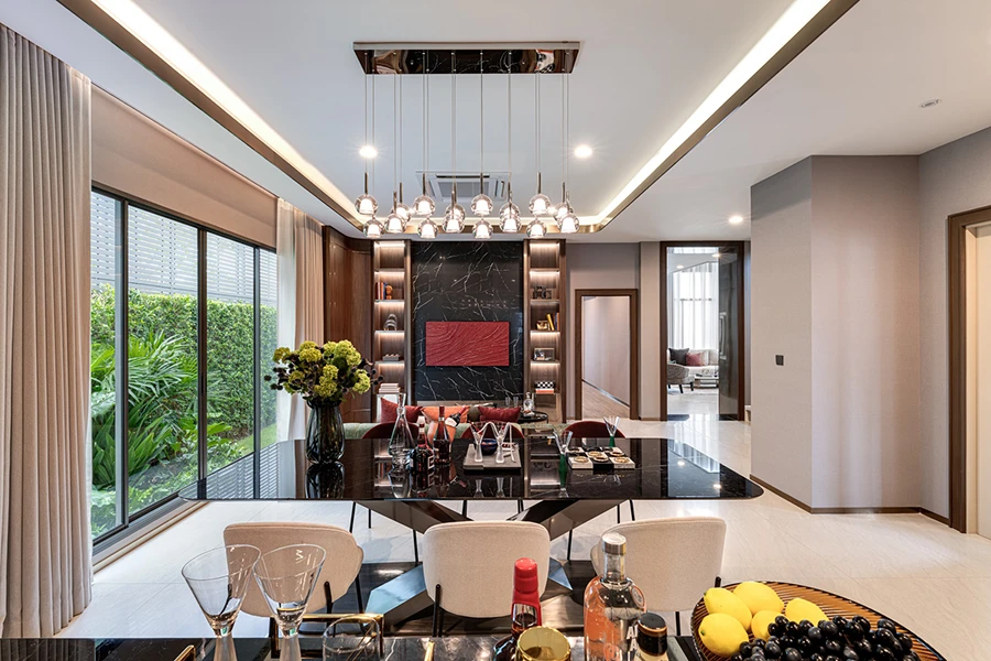 โครงการ SHAWN ปัญญาอินทรา บ้านเดี่ยวติดถนนใหญ่ สไตล์ MODERN TROPICAL CONTEMPORARY ท่ามกลางสิ่งอำนวยความสะดวกสำหรับการใช้ชีวิต ความพิเศษเริ่มจากที่ดินทุกแปลงเริ่มต้นที่ 100 ตารางวา ทำให้โครงการนี้ตอบโจทย์ครอบครัวขยายที่ต้องการพื้นที่ใช้สอย และที่ดินขนาดใหญ่ งานออกแบบบ้าน สะท้อนความเป็นส่วนตัว ภายใต้แนวคิด "Crafted to Last" โดยใช้ Facade เรียบง่าย ดึงดูดธรรมชาติเข้ามาเป็นส่วนหนึ่งในการออกแบบ เช่น ลวดลายของผิวไม้และลายหิน สีเอิร์ธโทน ทำให้บ้านมีชีวิตชีวา และน่าอยู่มากยิ่งขึ้น แปลนจะเป็นบ้านหน้ากว้าง สร้างความโอ่อ่าของตัวบ้าน และทำให้จัดสรรพื้นที่ในบ้านได้ดีขึ้น และจุดเด่นคือมี Double Volume บริเวณหน้าบ้าน ทั้งหมดนี้ทำให้มีแสงธรรมชาติเข้ามาทั่วถึงทั้งบ้าน ทำให้น่าอยู่อาศัยมากขึ้น ห้องนอนทุกห้องมีขนาดใหญ่ พร้อมห้องน้ำในตัวทุกห้อง เอ็กซ์คลูซีฟเพียง 72 ครอบครัว ทำเลใกล้โรงเรียนและสิ่งอำนวยความสะดวกมากมาย