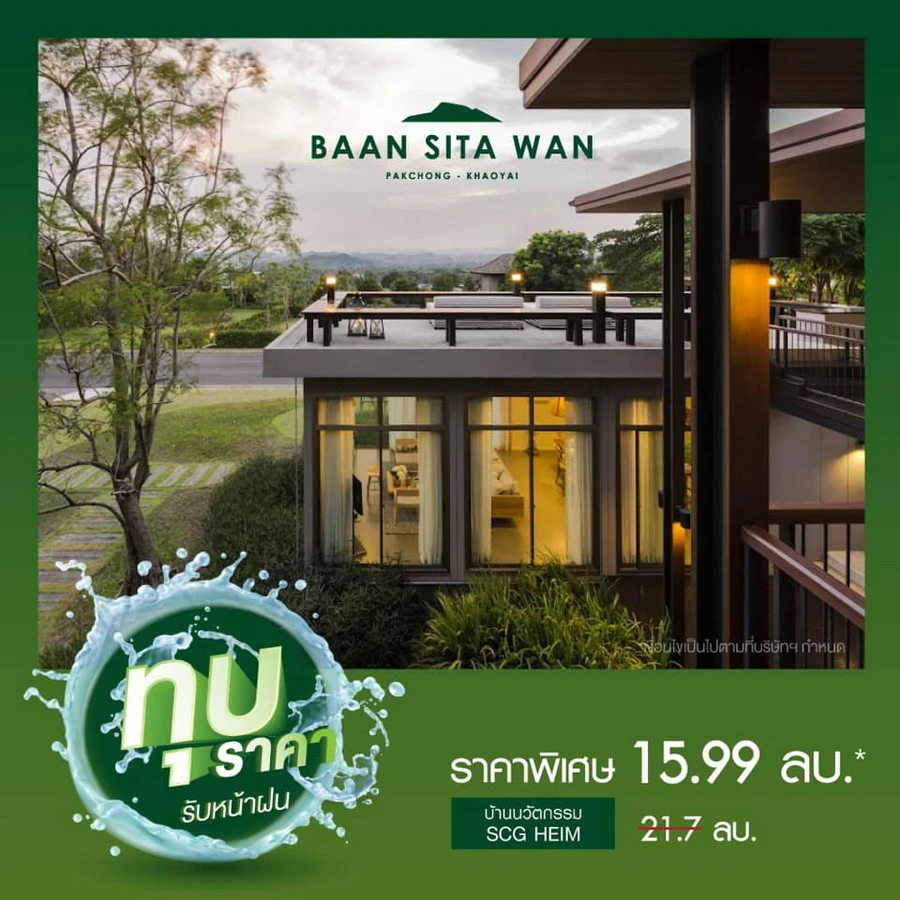 ขณะที่บ้านโซนต่างจังหวัดอย่าง โครงการ บ้านสีตวัน (Baan Sita Wan) ปากช่อง-เขาใหญ่ จัดโปรโมชั่น ทุบราคา รับหน้าฝน แปลงพิเศษ 15.99 ล้านบาท จากราคา 21.7 ล้านบาท สำหรับแปลงอื่นๆ มอบส่วนลดสูงสุดถึง 4 ล้านบาท ฟรีทุกค่าใช้จ่ายวันโอน