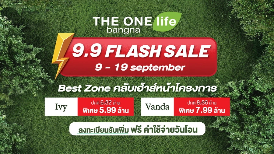 "เดอะวัน ไลฟ์ บางนา (The One Life Bangna)" บ้านโครงการใหม่ หน้าสาธิต ม.ราม 2 จัดแคมเปญ 9.9 Flash Sale Best Zone เปิดจองบ้านสวยท่ามกลางธรรมชาติ โซนคลับเฮ้าส์ ทำเลดีหน้าโครงการ ฟรีแอร์ ฟรีค่าใช้จ่ายวันโอน ราคาเริ่มต้นเพียง 5.9 - 8.5 ล้านบาท