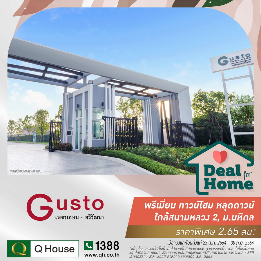 กัสโต้ เพชรเกษม ทวีวัฒนา (Gusto Petkasem-Thaweewattana) พรีเมี่ยมทาวน์โฮม ใกล้สนามหลวง2 ใกล้มหาวิทยาลัยมหิดล ราคาพิเศษ 2.65 ลบ.* (ปกติ 2.99 ลบ.) สะดวกเชื่อมสู่ถ.เพชรเกษม & ถ.บรมราชชนนี เข้า-ออก โครงการด้วยระบบ Easy Pass คลับเฮ้าส์ ฟิตเนส สระว่ายน้ำระบบเกลือ สนามเด็กเล่น