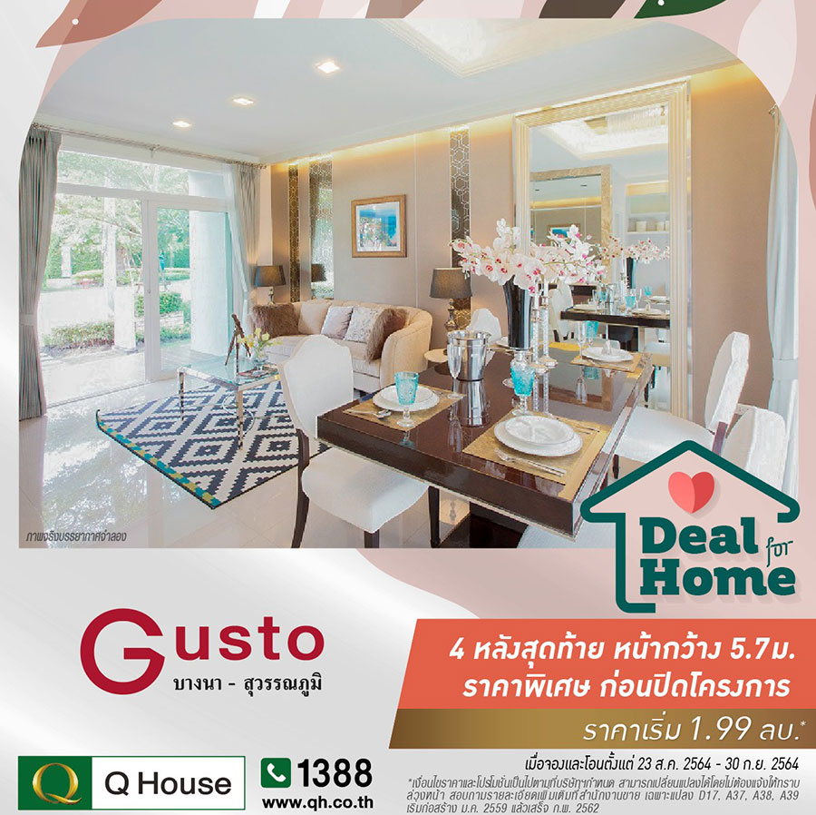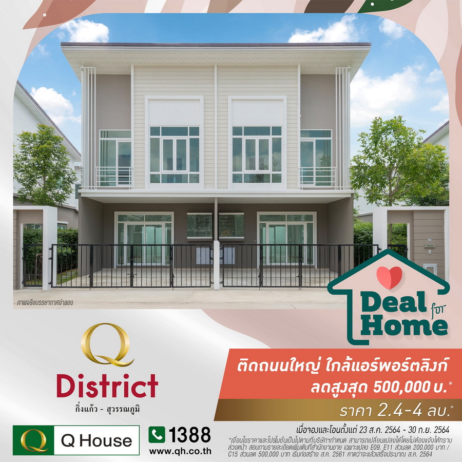 บริษัท ควอลิตี้เฮ้าส์ จำกัด (มหาชน) ผู้พัฒนาอสังหาริมทรัพย์ชั้นนำ จัดโปรโมชั่น "Deal for Home" ตอบโจทย์ทุกความต้องการ กับบ้านและทาวน์โฮม 47 โครงการ บนทำเลศักยภาพ ภายใต้แบรนด์ ควอลิตี้เฮ้าส์ คาซ่า เดอะทรัสต์ และกัสโต้ ราคาเริ่มต้น 1.99 - 24 ลบ.* จัดเต็มส่วนลดและของแถม พร้อมโปรโมชั่นพิเศษสุด Exclusive เมื่อจองและดอนตั้งแต่ 23 ส.ค. - 30 ก.ย. 2564