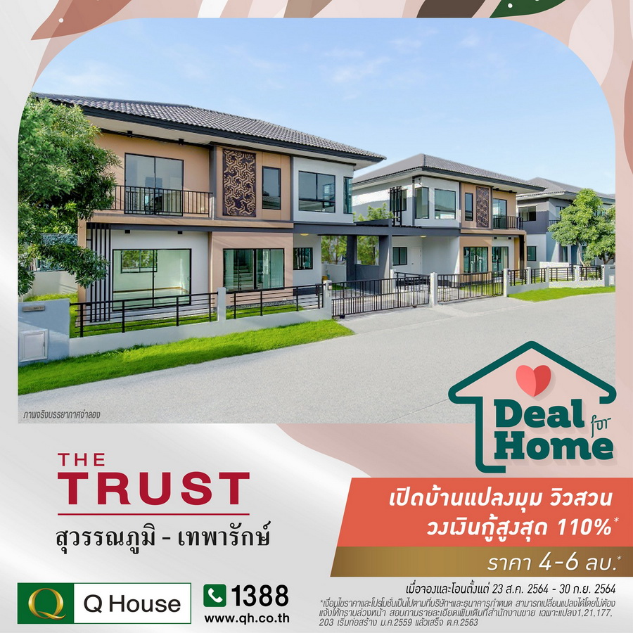 เดอะทรัสต์ สุวรรณภูมิ-เทพารักษ์ (The Trust Suvarnabhumi-Tapharak) บ้านพร้อมอยู่สไตล์โมเดิร์น แปลงมุม วิวสวน 3 ห้องนอน 3 ห้องน้ำ 2 ที่จอดรถ วงเงินกู้สูงสุด 110%* ผ่อนเริ่มต้นล้านละ 1,000 บ. ต่อเดือน สังคมพร้อมอยู่ ทำเลศักยภาพ ถนนบางนา-ตราด กม.17 ใกล้ทางด่วนบูรพาวิถี & สนามบินสุวรรณภูมิ ราคา 4-6 ลบ.*