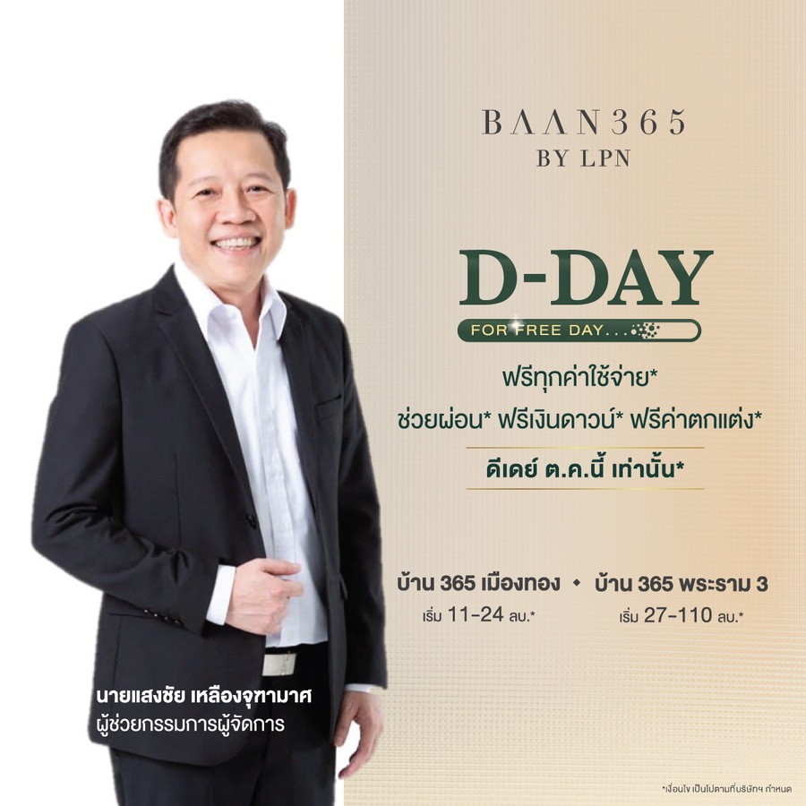 “BAAN 365” โดย แอล.พี.เอ็น.ดีเวลลอปเมนท์ บ้านหรูระดับพรีเมียมบนทำเลศักยภาพใจกลางเมืองทั้ง 2 ทำเล “BAAN 365 MUANGTHONG” และ “บ้าน 365 พระราม 3 (Baan 365 Rama 3)” ร่วมจัดแคมเปญพิเศษ “D-DAY FOR FREE DAY” ไม่ว่าจะเป็น การช่วยผ่อนสูงสุด 5 ล้านบาท* ฟรีเงินดาวน์* ฟรีค่าตกแต่ง* ฟรีทุกค่าใช้จ่ายวันโอน* และฟรีค่าส่วนกลาง* (เงื่อนไขและรายละเอียดแคมเปญเป็นไปตามที่บริษัทฯกำหนด)