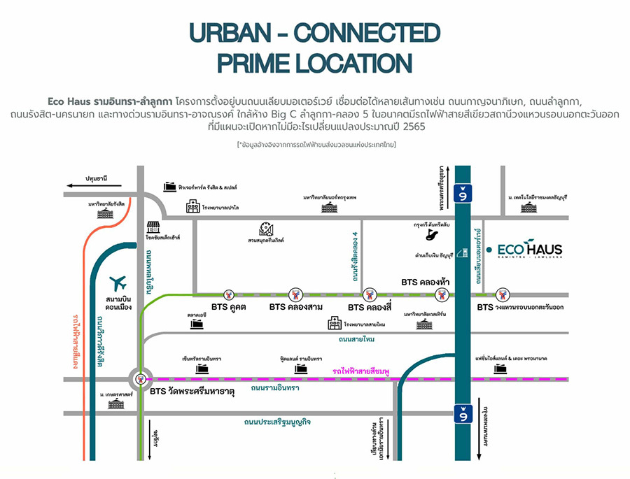 อีโค เฮ้าส์ วงแหวน - ลำลูกกา (ECO HAUS Wongwaen - Lamlukka) บ้านทรงอิสระ 3 ห้องนอน 3 ห้องน้ำ 2 ที่จอดรถ ผสมผสานการใช้ชีวิตในแบบคนเมือง เข้ากับธรรมชาติ ได้อย่างลงตัวด้วยพื้นที่สีเขียวส่วนกลางขนาดใหญ่ ตั้งอยู่บนพื้นที่ที่สามารถเชื่อมต่อเข้าสู่ใจกลางเมืองได้อย่างสะดวก รวมถึงเชื่อมต่อไปยังเส้นทางหลักได้หลายเส้นทาง ทั้งทางด่วนรามอินทรา-อาจณรงค์ เชื่อมต่อสู่ใจกลางเมือง ถนนวงแหวนฯ รอบนอก เชื่อมต่อการเดินทางสู่ภูมิภาคต่างๆ รวมทั้งเชื่อมต่อไปยังสนามบินสุวรรณภูมิได้อย่างสะดวก