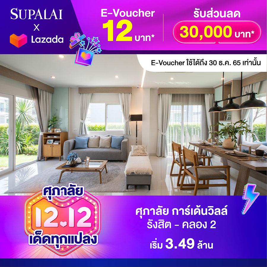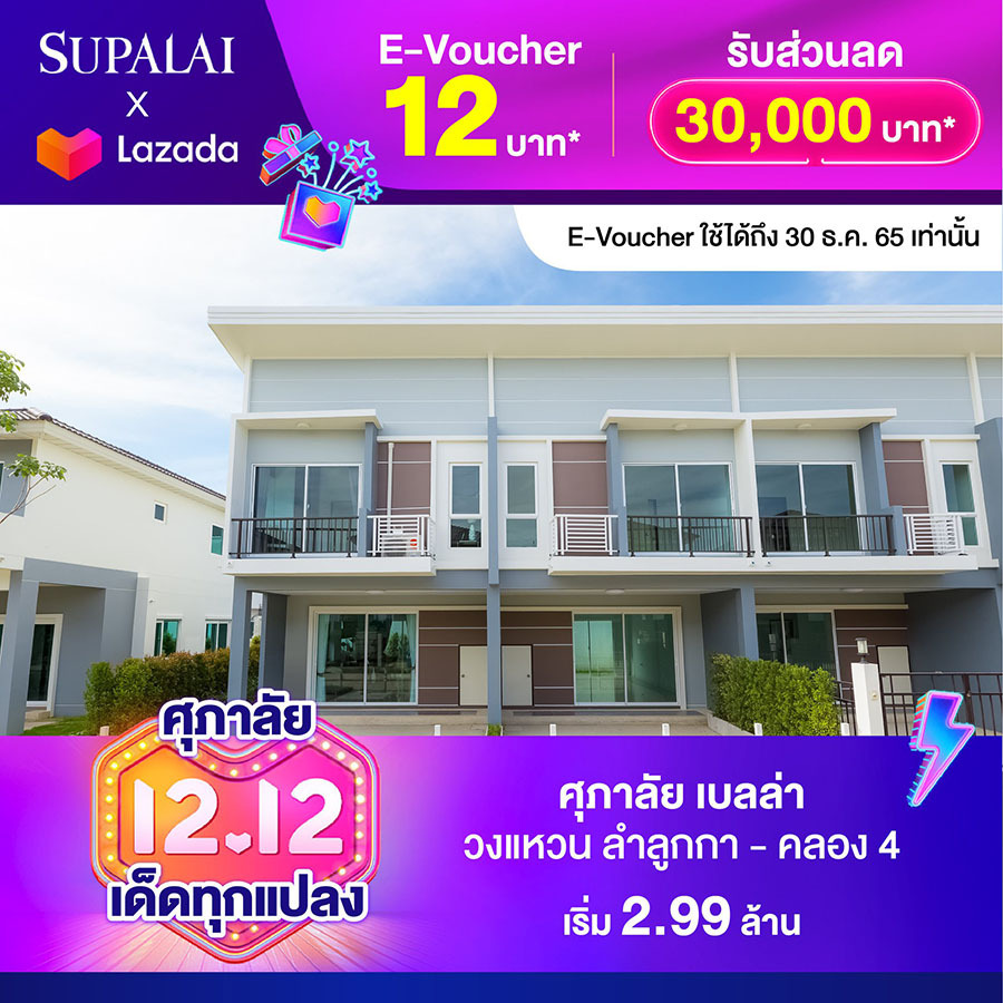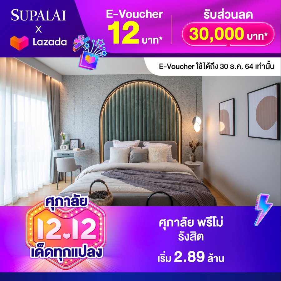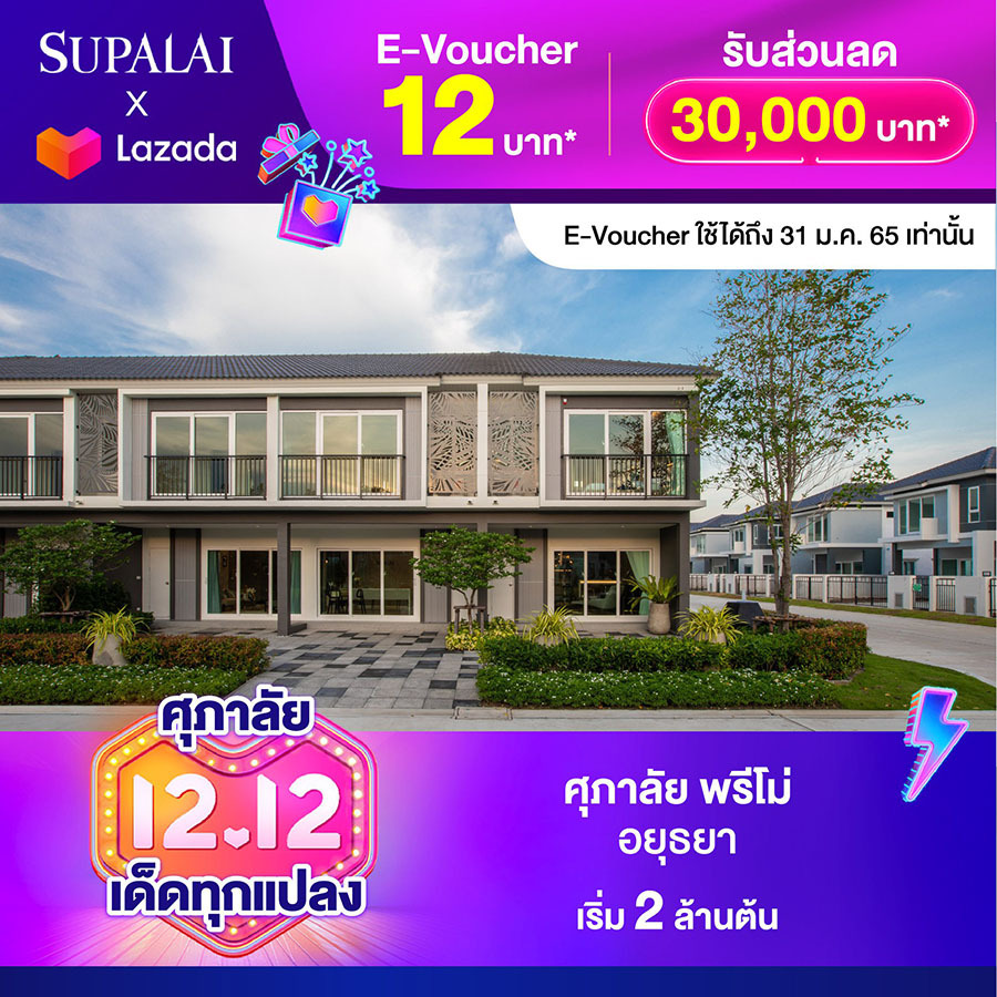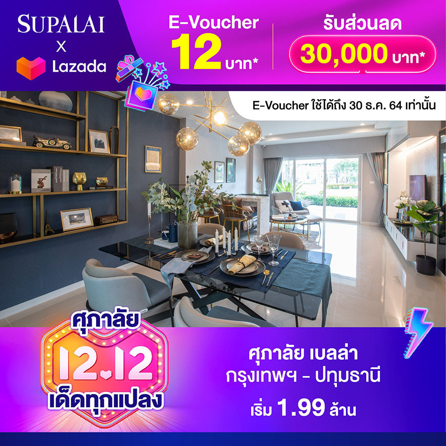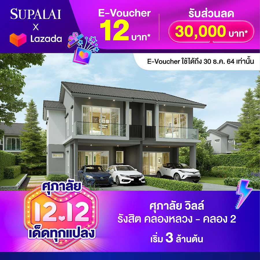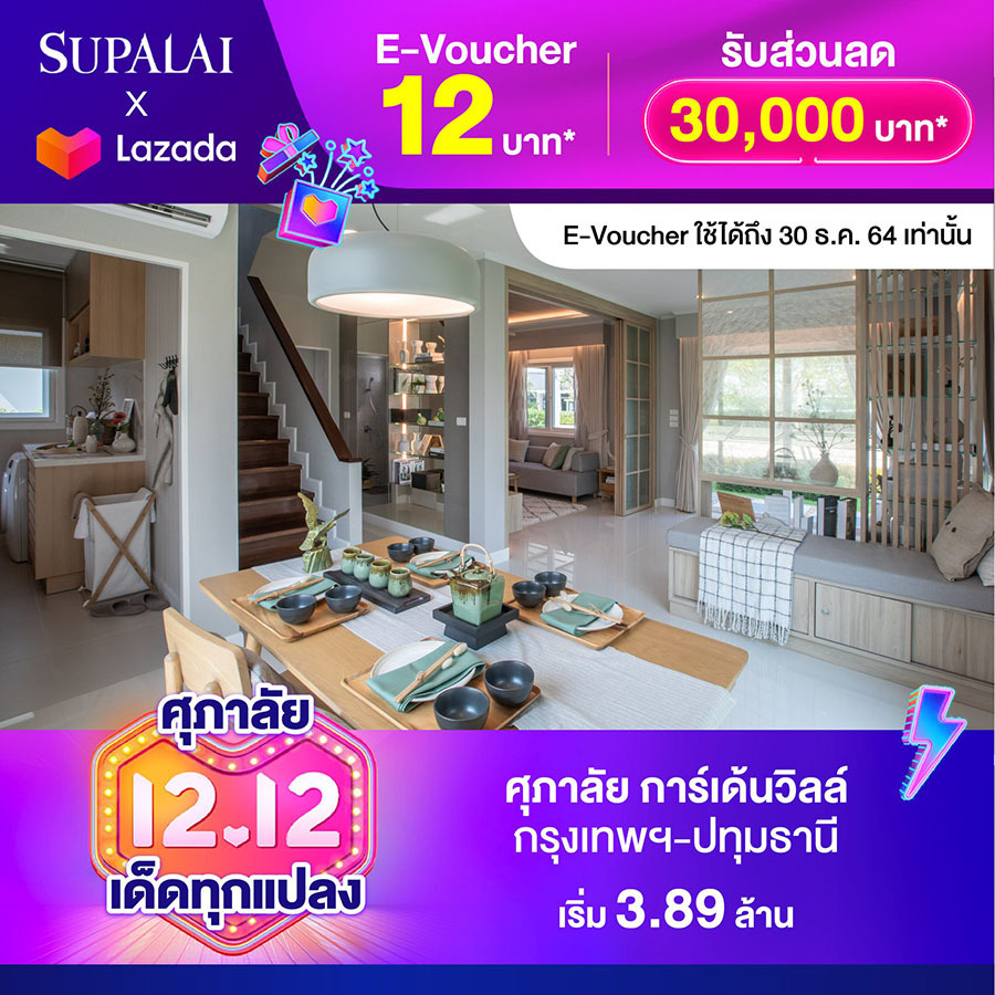 บริษัท ศุภาลัย จำกัด (มหาชน) ส่งโปรสุดร้อนแรงรับสิ้นปี FINAL CALL 12.12!! Supalai X Lazada สำหรับการซื้อบ้านเดี่ยว บ้านแฝด ทาวน์โฮม ในโซนรังสิต, ลำลูกกา, กรุงเทพฯ-ปทุมธานี และอยุธยา ง่ายๆ เพียง ซื้อ E-Voucher เพียง 12 บาท ใน Lazada Application นำมาใช้รับส่วนลดเพิ่ม 30,000 บาท* พร้อมรับของแถมอีกมากมาย ตั้งแต่วันนี้ 1 ธ.ค. - 30 ธ.ค. 64 เท่านั้น
