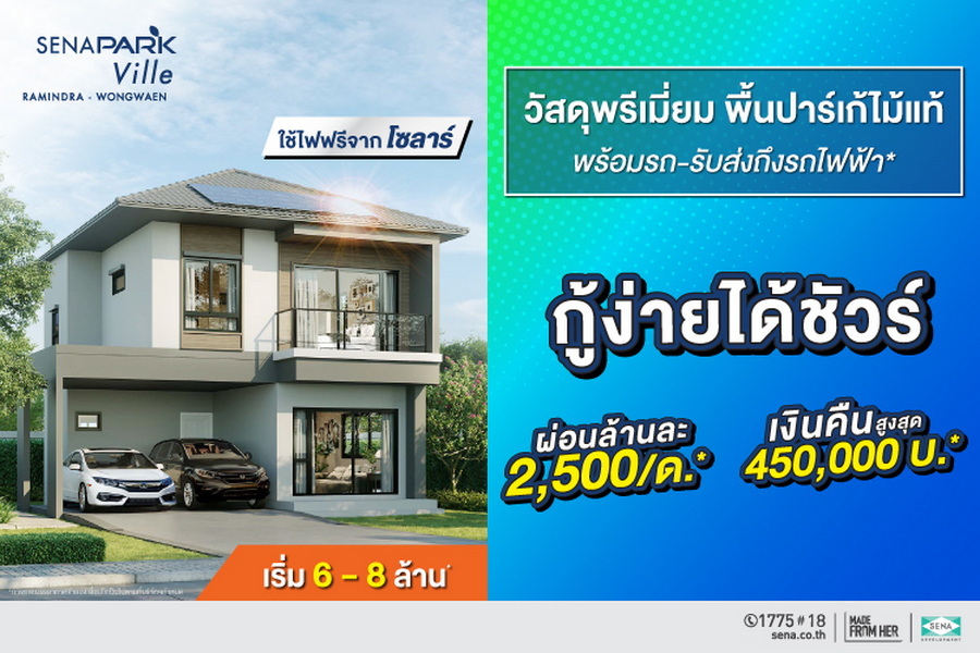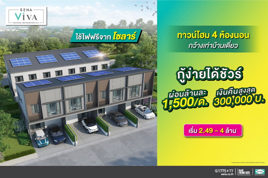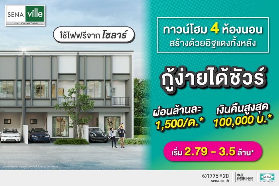 SENA ขานรับผ่อนคลายมาตรการ LTV จัดแคมเปญกระตุ้นยอดขายทิ้งทวนส่งท้ายปีวัว "กู้ง่ายได้ชัวร์" ผ่อนล้านละ 1,500 บาท ฟรี!ค่าโอนฯ พร้อมรับเงินคืนสูงสุด 1.5 ล้านบาท ส่ง 10 โครงการทั้งแนวราบ - ทาวน์โฮมทำเลคุณภาพทั้งในกรุงเทพฯ และต่างจังหวัด เริ่มตั้งแต่วันนี้จนถึงสิ้นปี 64