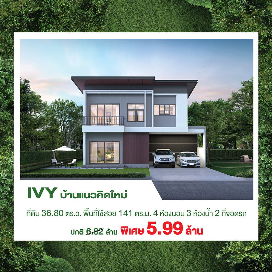 แบบบ้าน Ivy พื้นที่ใช้สอย 141 ตร.ม. บนที่ดิน 36.80 ตร.ว. ขนาด 4 ห้องนอน 3 ห้องน้ำ 2 ที่จอดรถ ราคาพิเศษเพียง 5.99 ล้านบาท (จากราคาปกติ 6.82 ล้านบาท)