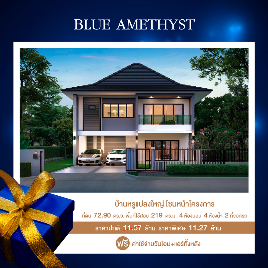 บ้านหรูหลังใหญ่ Blue Amethyst บ้านหรูแปลงใหญ่พิเศษ เอาใจคนชอบที่ดินกว้างๆ มีพื้นที่ข้างบ้านและหลังบ้าน ให้คุณได้สรรค์สร้างความสุขให้กับครอบครัวได้อย่างเต็มที่ บนที่ดิน 72.90 ตร.ว พื้นที่ใช้สอย 219 ตร.ม