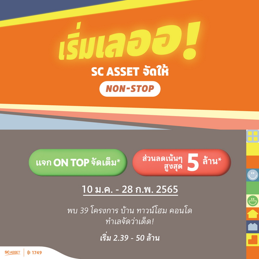 ชวนดีเจ้นุ้ย พิธีกรอารมณ์ดี ท้าให้ เอ้ BOTCASH โปรดิวเซอร์สายแดนซ์มือทอง มาแต่งเพลงจากคำว่า เริ่มเลออ! ที่ฟังแล้วหากอยากได้บ้านใหม่ ก็ .. เริ่มเลออ! แบบ NON-STOP แจก ON TOP จัดเต็ม กับ 39 โครงการ บ้าน ทาวน์โฮม คอนโด ทำเลจัดว่าเด็ด!! ที่มาพร้อมส่วนลดสูงสุด 5 ล้านบาท เริ่มพร้อมกันทั่วประเทศ 10 มกราคม 2565 – 28 กุมภาพันธ์ 2565 ราคาเริ่ม 2.39-50 ล้าน ที่ SALES GALLERY ที่อยู่ทุกที่รอบตัวคุณ