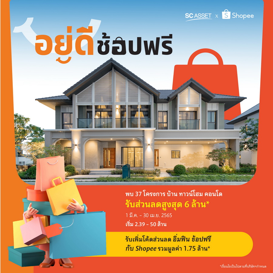 SC Asset ผู้พัฒนาอสังหาริมทรัพย์ชั้นนำ ร่วมส่งมอบ Living Solutions เพื่อทุกเช้าที่ดี จับมือ ช้อปปี้ (Shopee) ผู้นำแพลตฟอร์มอีคอมเมิร์ซในภูมิภาคเอเชียตะวันออกเฉียงใต้และไต้หวัน เฉลิมฉลองมหกรรมแคมเปญสุดยิ่งใหญ่ครั้งแรกของปี “Shopee 3.15 Consumer Day คืนกำไรให้นักช้อป” ยกขบวน บ้าน ทาวน์โฮม คอนโด บนทำเลศักยภาพ กว่า 37 โครงการ ในราคาเริ่มต้น 2.39 - 50 ล้านบาท จัดแคมเปญพิเศษ #อยู่ดีช้อปฟรี เสิร์ฟให้คุณถึงบ้าน รับส่วนลดสูงสุด 6 ล้าน* พร้อมรับเพิ่ม! “โค้ดช้อปฟรี อิ่มฟิน” มูลค่ารวมกว่า 1.75 ล้าน* ตั้งแต่วันที่ 1 มีนาคม - 30 เมษายน 2565 นี้เท่านั้น