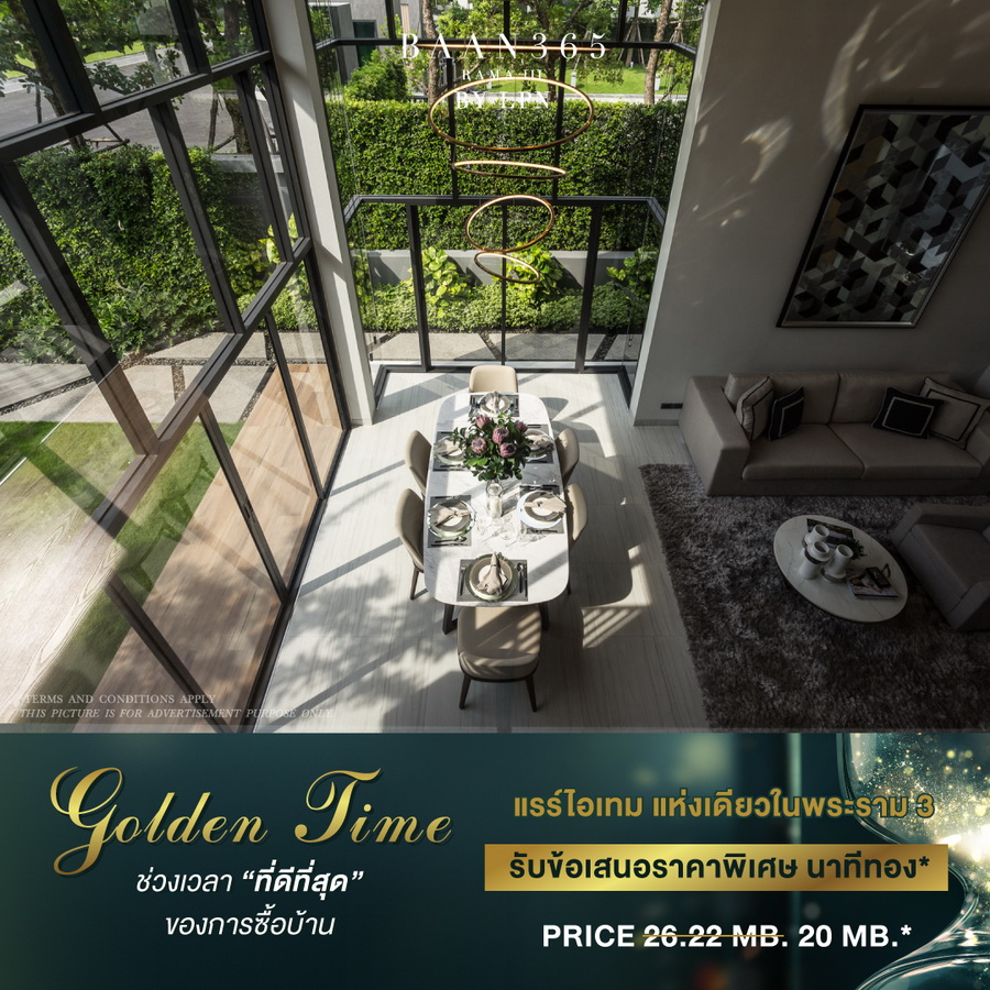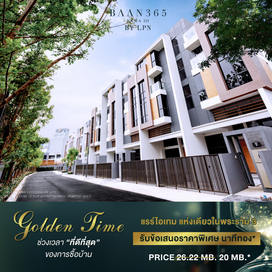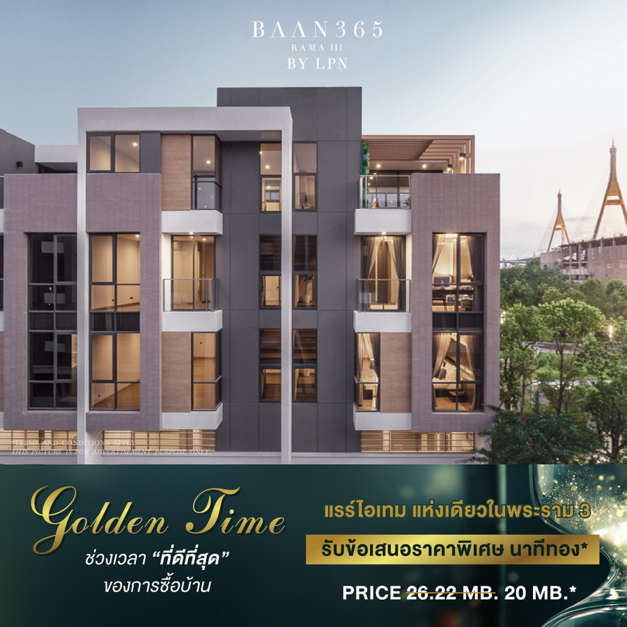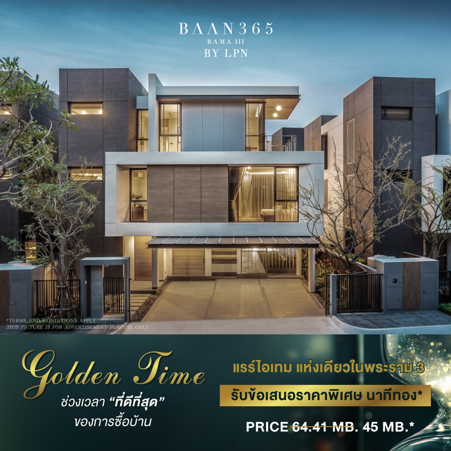 BAAN 365 RAMA III โดย LPN มอบช่วงเวลา “ที่ดีที่สุด” ของการมีบ้าน ด้วยแคมเปญ “Golden Time” ร่วมเป็นส่วนหนี่งกับเอกสิทธิ์พิเศษแห่งการใช้ชีวิตเหนือระดับ ทั้งบ้านเดี่ยว ทาวน์โฮมหรู โอกาสพิเศษนาทีทองกับ แรร์ไอเทม แห่งเดียวบนทำเล พระราม 3 พื้นที่ใจกลางเมืองสะดวกทุกการเดินทาง ที่หาไม่ได้อีกแล้วในทำเลนี้ กับบ้านเดี่ยวหลังพิเศษ ราคาเริ่มต้นที่ 45 ล้านบาท* และทาวน์โฮมหรู ราคาเริ่มต้นที่ 20 ล้านบาท* ตั้งแต่วันนี้ - 31 มีนาคม 2565 นี้