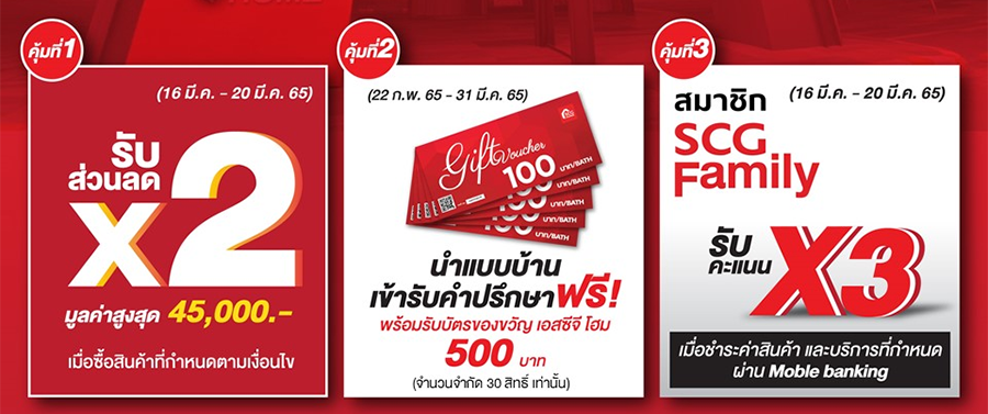คุ้มที่ 2 : เมื่อนำแบบบ้านเข้ารับคำปรึกษา รับฟรีบัตรของขวัญ เอสซีจี โฮม มูลค่า 500 บาท จำนวนจำกัด 30 สิทธิ์ เท่านั้น (22 ก.พ.65 - 31 มี.ค.65)