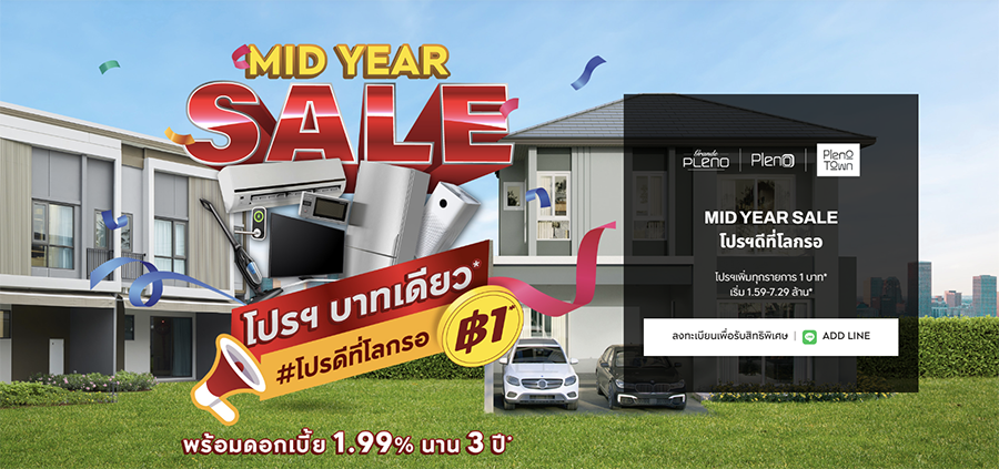 PLENO ยกทัพทาวน์โฮมพร้อมอยู่ กว่า 30 โครงการทั่วกรุงเทพฯ กับมหกรรม "MID YEAR SALE โปรฯดีที่โลกรอ" ลดหนักจัดเต็ม โปรฯ เพิ่มทุกรายการ 1 บาท* จัดให้เต็มจนล้นบ้านพร้อมข้อเสนอพิเศษมากมายกลางปี เริ่ม 1.59 - 7.29 ล้าน*