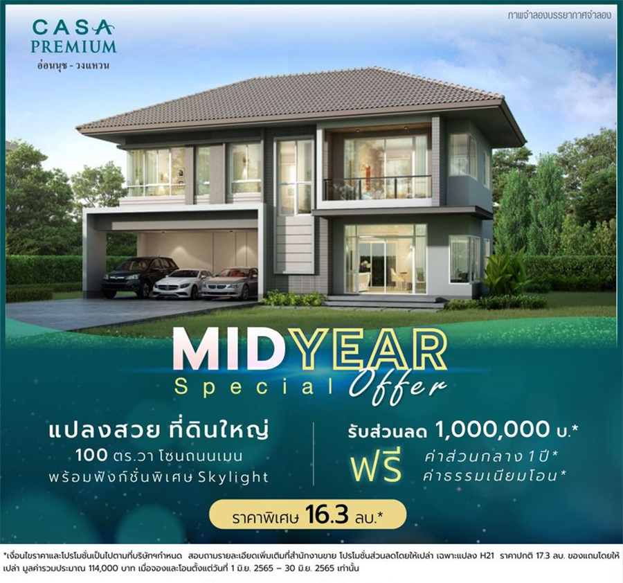 *เงื่อนไขและโปรโมชันเป็นไปตามที่บริษัทฯ กำหนด รายการของแถมอาจแตกต่างไปตามเงื่อนไขของแต่ละโครงการ และขอสงวนสิทธิ์ในการเปลี่ยนแปลงโดยมิต้องแจ้งให้ทราบล่วงหน้า / *อัตราผ่อนเป็นไปตามที่ธนาคารกำหนด โปรโมชันนี้จองและโอนภายใน มิ.ย. 2565