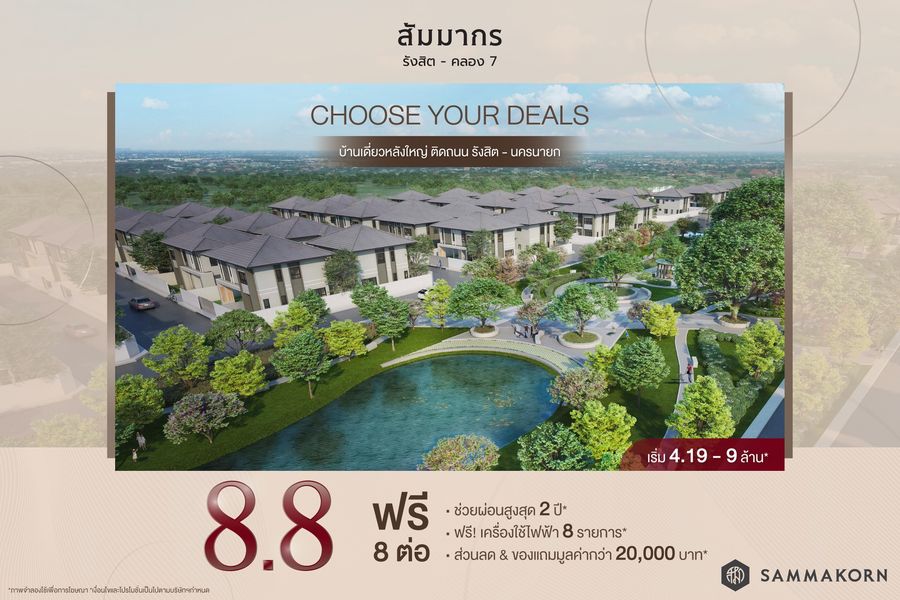 8.8 นี้ รับฟรี! 8 ต่อ* ที่ "สัมมากร รังสิต คลอง 7" บ้านเดี่ยวหลังใหญ่ ทำเลดีที่สุด ติดถนนใหญ่ “รังสิต นครนายก” ส่วนกลางธรรมชาติ 5 ไร่ บรรยากาศรีสอร์ท เริ่ม 4.19 – 9 ล้าน* 8.8 CHOOSE YOUR DEAL! ขนโปรมาให้แบบจุกๆ จองวันนี้ รับฟรี! 8 ต่อ* ลงทะเบียนรับสิทธิ์ https://bit.ly/3QkuWc0