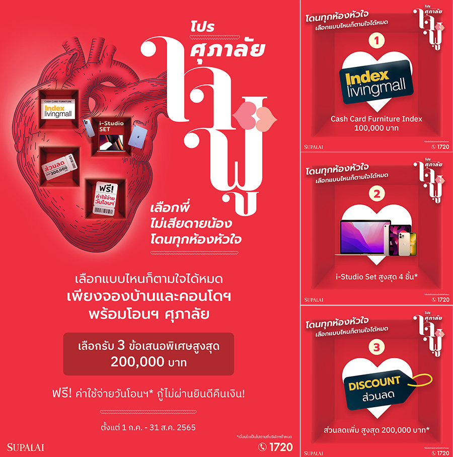 โปรใหม่หัวใจสีชมพู กับโปร“ศุภาลัย…ใจฟู” เลือกพี่ไม่เสียดายน้อง โดนทุกห้องหัวใจ ? ชอบแบบไหนก็ตามใจได้หมด!! เมื่อจองบ้านและคอนโดฯ พร้อมโอนฯ จากศุภาลัย 1 กรกฎาคม – 31 สิงหาคม 2565 เท่านั้น รับโปรสุดปัง ที่โดนจังๆ ทุกห้องหัวใจ!