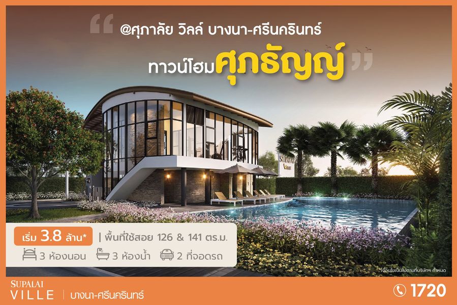 “โอกาสทอง” จองบ้านได้ทอง!! ที่โครงการ "ศุภาลัย วิลล์ บางนา-ศรีนครินทร์" ทาวน์โฮม ศุภธัญญ์ เริ่มเพียง 3.8 ล้าน* พื้นที่ใช้สอย 126 & 141 ตร.ม. 3 ห้องนอน 3 ห้องน้ำ 2 ที่จอดรถ รับเลยไม่ต้องลุ้น ฟรี! บัตรกำนัลทองคำ AURORA มูลค่า 30,000 บาท* รับเพิ่ม
