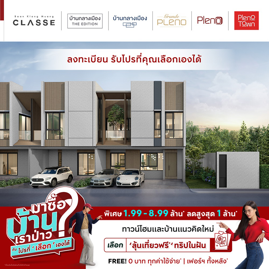 ทาวน์โฮมและบ้านแนวคิดใหม่เครือเอพี ภายใต้แบรนด์บ้านกลางเมือง และพลีโน่ เลือก! ลุ้นเที่ยวฟรีกับทริป ในฝัน จำนวน 70 รางวัล มูลค่ากว่า 3 ล้านบาท พิเศษรับ ฟรี 0 บาททุกค่าใช้จ่าย และฟรีเฟอร์นิเจอร์ทั้งหลัง พร้อมท็อปอัพส่วนลดรายโครงการสูงสุดถึง 1 ล้านบาท สำหรับทาวน์โฮมราคาเริ่ม 1.99 - 8.99 ล้านบาท