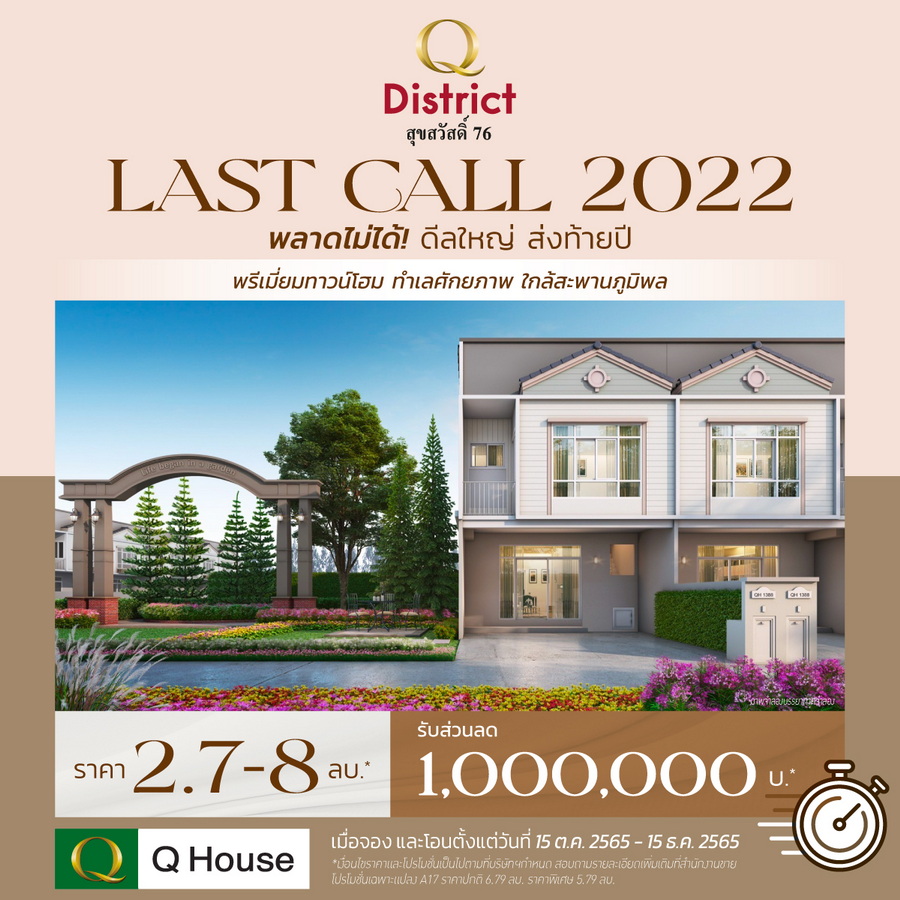 (*เงื่อนไขราคาและโปรโมชั่น "LAST CALL 2022" เฉพาะแปลง เฉพาะโครงการที่เข้าร่วมแคมเปญ รายการโปรโมชั่นนี้อาจเปลี่ยนแปลงได้โดยไม่ต้องแจ้งให้ลูกค้าทราบล่วงหน้าและเป็นไปตามเงื่อนไขที่บริษัทฯกำหนด)