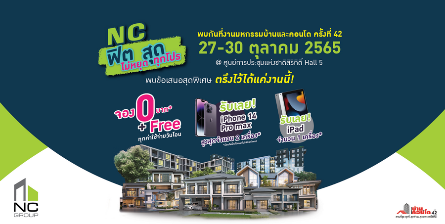 NC ฟิตสุด ไม่หยุด ทุกโปร พบข้อเสนอสุดพิเศษ ตรึงไว้ได้แค่งานนี้ จอง 0 บาท* + Free ทุกค่าใช้จ่ายวันโอน รับเลย iPhone 14 Pro Max สูงสุดจำนวน 2 เครื่อง* รับเลย iPad จำนวน 1 เครื่อง*