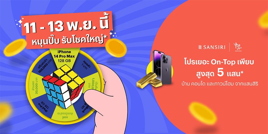 แมทช์ด้วยตัวเองได้แล้ววันนี้ เลือกรับ โปรที่ชอบ กับบ้านที่ใช่ ให้คุณได้ข้อเสนอที่ดีที่สุด ห้ามพลาดเฉพาะ 11 - 13 พ.ย. นี้ จองเลย! รับสิทธิ์หมุนวงล้อ หมุนปั๊บ รับโชคใหญ่ โปรเยอะ On-Top เพียบ* ส่วนลด และเงินคืน* / iPhone 14 Pro Max* / iPad Pro* / ทองคำ / Mac Book Air M2* และอื่นๆ อีกมากมาย* ตั้งแต่วันที่ 1 ต.ค. - 30 ธ.ค. 65