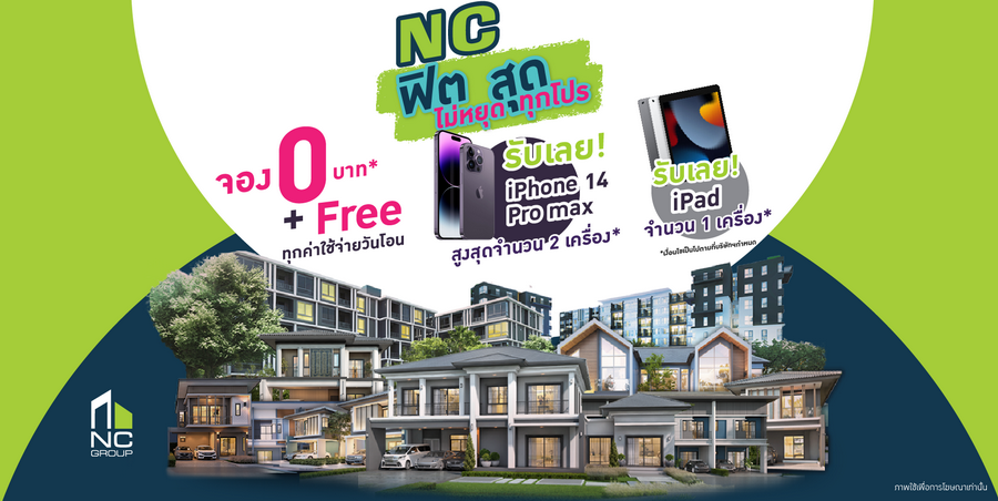 NC ฟิตสุด ไม่หยุด ทุกโปร จอง 0 บาท* + Free ทุกค่าใช้จ่ายวันโอน รับเลย iPhone 14 Pro Max สูงสุดจำนวน 2 เครื่อง รับเลย iPad จำนวน 1 เครื่อง
