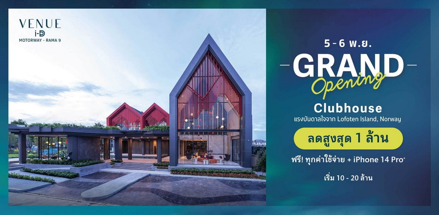 "เวนิว ไอดี มอเตอร์เวย์ – พระราม 9" พบกัน 5-6 พฤศจิกายน นี้ Grand Opening CLUBHOUSE เปิดชมคลับเฮ้าส์ครั้งแรก แรงบันดาลใจจากหมู่เกาะในฝันของนอร์เวย์ “Lofoten Islands” ลด 1 ล้าน + ฟรีทุกค่าใช้จ่าย + Iphone 14 Pro*