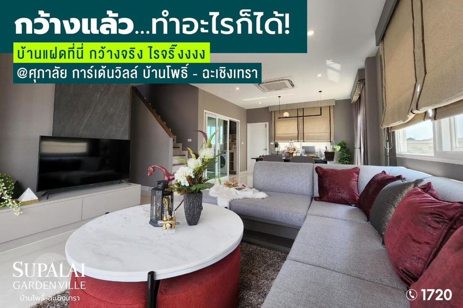 โตแล้ว...ทำไรก็ได้! มีบ้านกว้างงงงง แล้ว .... ทำอะไรในบ้านก็ได้ ก็บ้านมันกว้างงงงงง ขนาดนี้ ต้องใช้พื้นที่ให้คุ้ม บ้านแฝดที่มี 4 ห้องนอน บ้านแฝดที่มีพื้นที่กว้างถึง 154 ตร.ม. บ้านแฝดที่มีห้องครัวแยกเป็นสัดส่วน ไม่ต้องต่อเติม บ้านแฝดที่ใช้วัสดุคุณภาพเยี่ยม มาเริ่มต้นเรื่องราวที่ดีของคุณ ในบ้านที่ดี...เพื่อความสุขของทุกคนในครอบครัว @ศุภาลัย การ์เด้นวิลล์ บ้านโพธิ์ – ฉะเชิงเทรา บ้านแฝดเริ่มเพียง 3.59 ล้าน* ฟรี! ของแถมกว่า 9 รายการ อาทิ