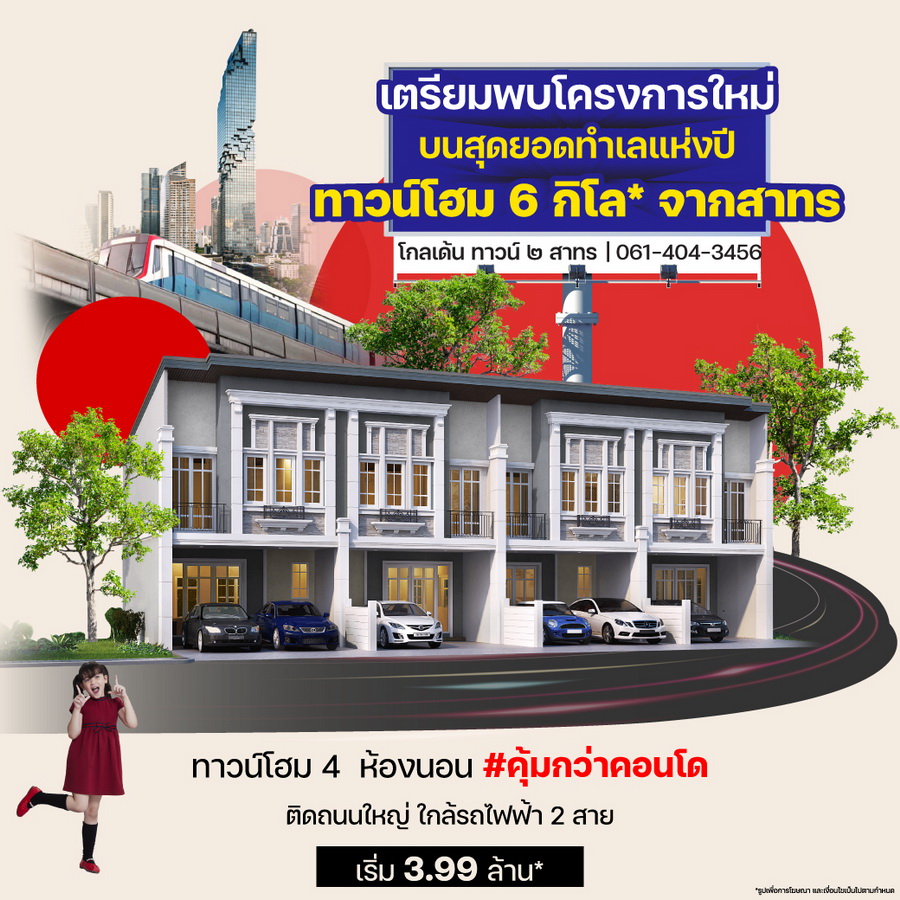 เตรียมพบทาวน์โฮมบนสุดยอดทำเลแห่งปี เพียง 6 กิโล* จากสาทร รถไฟฟ้าต่อเดียวถึงสีลม ลงทะเบียน #รับส่วนลด 50,000 บาท* คลิก it.ly/3XHcgY9 โกลเด้น ทาวน์ ๒ สาทร | เริ่ม 3.99 ล้าน* ทาวน์โฮมโครงการใหม่ ครบทุกฟังก์ชันของชีวิต สไตล์อังกฤษ 4 ห้องนอน 2 ที่จอดรถ ฟังก์ชันครบ ห้องพระ + ครัวไทย Clubhouse พร้อมสระว่ายน้ำขนาดใหญ่ ทาวน์โฮมทำเลคอนโด ลงตัวทุกการเดินทาง ที่สุดแห่งทำเล เพียง 6 กิโล* จากสาทร ใกล้รถไฟฟ้าสถานี "บางหว้า" Interchange 2 สาย เชื่อมต่อ สาทร, สีลม, สยาม, สามย่าน ติดถนนใหญ่