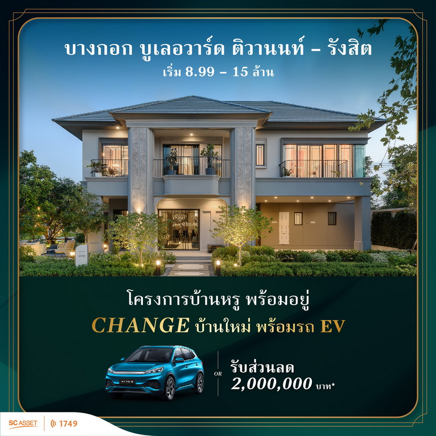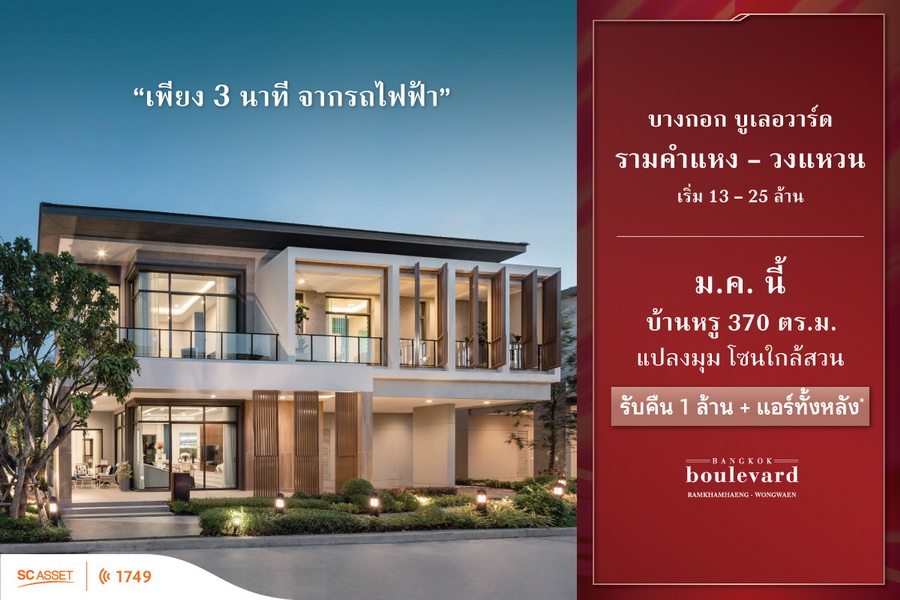 BANGKOK BOULEVARD รามคำแหง-วงแหวน บ้านหรูแปลงมุม 370 ตร.ม. โซนใกล้สวน ม.ค.นี้ รับเงินคืน 1 ล้าน + แอร์ทั้งหลัง* ลงทะเบียนรับสิทธิพิเศษเพิ่ม 100,000 บาท* : https://m.scasset.com/BWLN บ้านหรูซีรีส์ใหม่ LANAI SERIES บนทำเลศักยภาพ ที่มูลค่าเพิ่มขึ้นในทุกวัน ใกล้สถานีรถไฟฟ้าเพียง 3 นาที และรายล้อมด้วยโรงเรียนนานาชาติชั้นนำ* สัมผัสชีวิตที่ไหลลื่น ผสานความหรูหรา และใส่ใจรายละเอียด ด้วยงานดีไซน์ที่เป็นเอกลักษณ์ และความเป็นส่วนตัว เพียง 42 ครอบครัว พบฟังก์ชั่นแนวคิดใหม่ - พื้นที่ Semi-outdoor พร้อมช่องแสง ขนาดใหญ่ ให้คุณเชื่อมต่อธรรมชาติได้มากขึ้น - โปร่งสบายด้วย ความสูงเพดานชั้นบน 3.4 เมตร - Relax area ชั้นลอยอเนกประสงค์ ปรับเปลี่ยนตาม Lifestyle เริ่ม 13 - 25 ล้าน