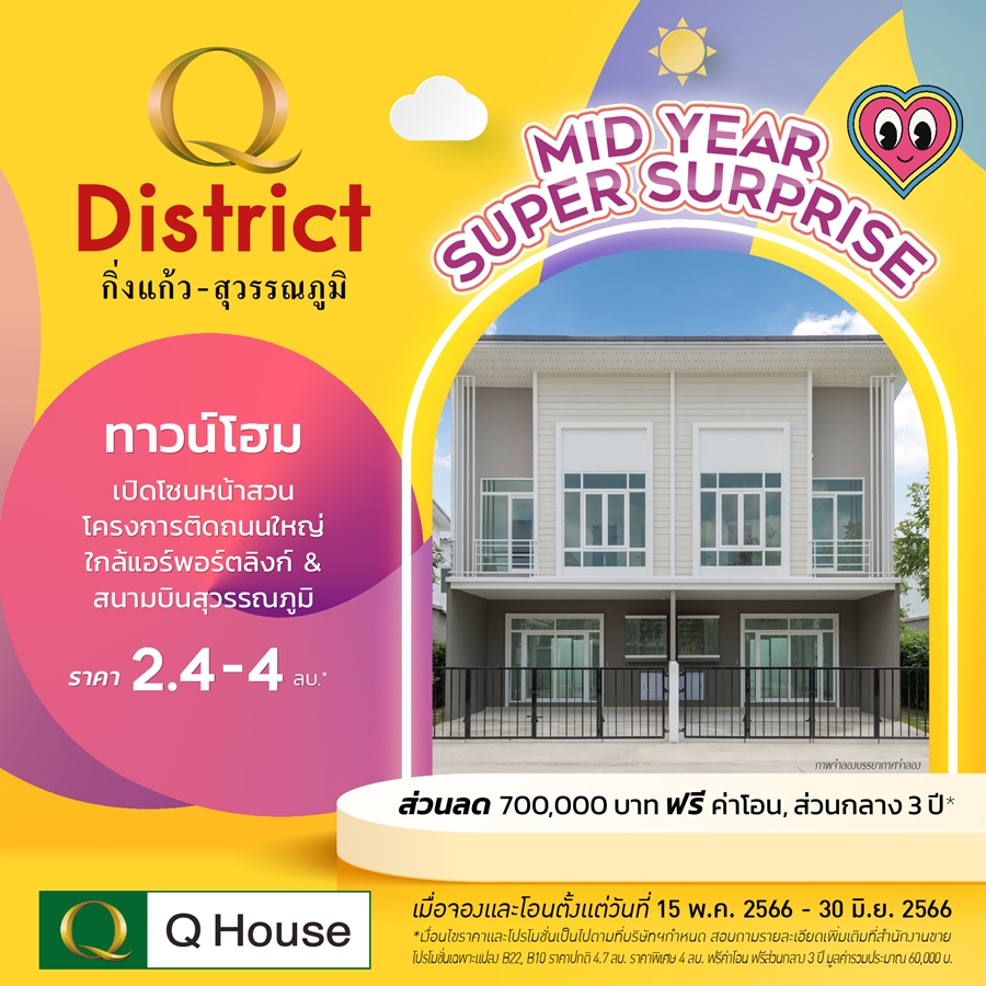 บริษัท ควอลิตี้เฮ้าส์ จำกัด (มหาชน) ผู้พัฒนาอสังหาริมทรัพย์ชั้นนำ เปิดเผยว่า เพื่อกระตุ้นยอดขาย ในช่วงโค้งสุดท้ายไตรมาส 2/2566 ล่าสุดได้เปิดตัว โปรโมชั่นแคมเปญ “MID YEAR SUPER SURPRISE” มอบส่วนลดมูลค่าตั้งแต่ 200,000 - 1,000,000 บาท* และสิทธิพิเศษอื่นๆอีกมากมาย อาทิ ฟรีค่าธรรมเนียมการโอน* ฟรีค่าส่วนกลาง 2 ปี – 3 ปี* ฟรีค่าจดจำนอง ฟรีแอร์* (เฉพาะโครงการ) ให้กับลูกค้าที่จองบ้านแฝด หรือ ทาวน์โฮม พร้อมอยู่กับ 19 โครงการของบริษัทฯและบริษัทในเครือ ภายใต้แบรนด์ Q Prime Q District คาซ่า เดอะทรัสต์ และกัสโต้ในเขตกรุงเทพฯ ปริมณฑล และจังหวัดชลบุรี ราคาเริ่ม 2.4 ล้านบาท* เมื่อจองและโอนตั้งแต่ 15 พ.ค. 2566 – 30 มิ.ย. 2566 เท่านั้น