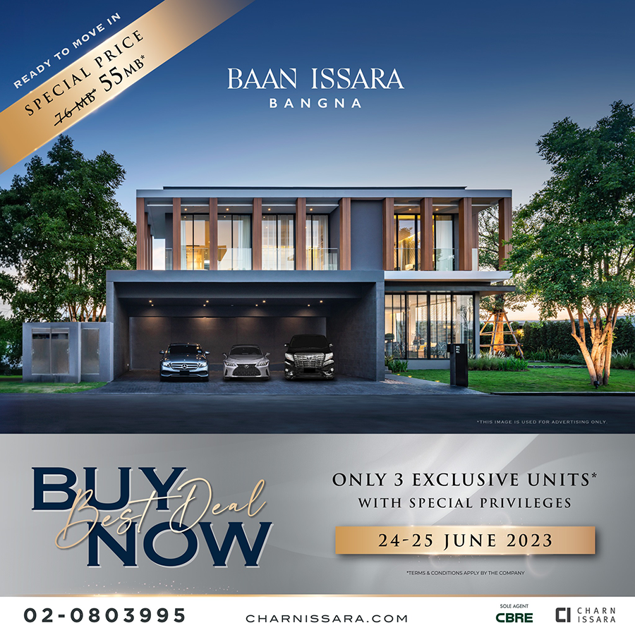 โครงการ บ้านอิสสระ บางนา (Baan Issara Bangna) บ้านเดี่ยวระดับซูเปอร์ลักชัวรี่ จัดโปรโมชั่นดีลเด็ดโดนใจ Buy Now Best Deal กับ 3 ยูนิตพิเศษ ซื้อวันนี้ รับดีลดีสุด ในราคาเริ่มต้นเพียง 55 ล้านบาท* (จากราคาปกติ 76 ล้านบาท) พร้อมSpecial Privilege* อีกมากมาย ให้ลูกค้าได้มาร่วมสัมผัสนิยาม Super Luxury ภายใต้ แรงบันดาลใจสไตล์ Modern Tropical ที่สะท้อนความเรียบหรู ของการใช้ชีวิตที่อิสสระ พิเศษเฉพาะ วันที่ 24-25 มิถุนายน 2566 นี้ ณ โครงการ บ้านอิสสระ บางนา