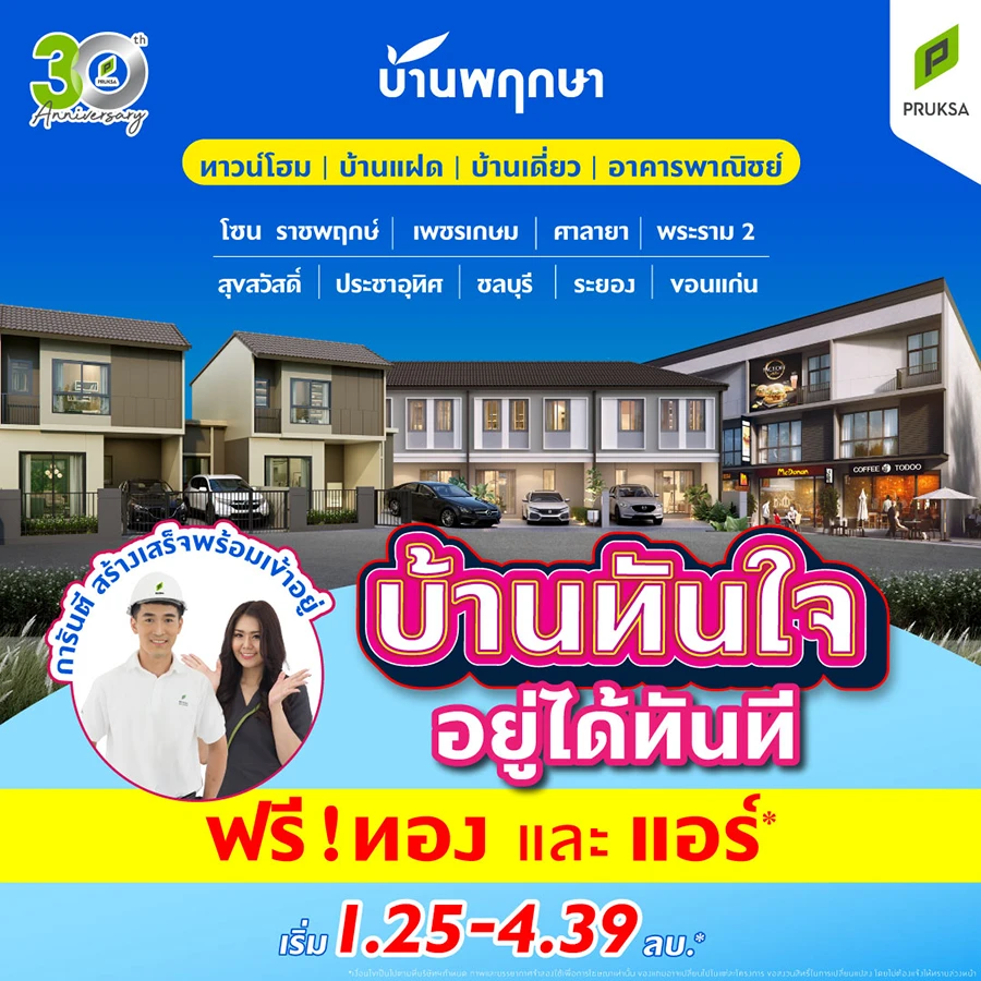 สอบถามรายละเอียดเพิ่มเติมได้ที่ โทร. 1739 เว็บไซต์ https://www.pruksa.com/
