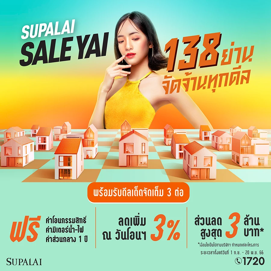 บมจ.ศุภาลัย จัดหนักไม่มีกั๊ก ส่งโครงการแนวราบบ้านสร้างเสร็จพร้อมอยู่ทั้งกรุงเทพฯ ปริมณฑล และภูมิภาค อัดแคมเปญ “SUPALAI SALE YAI 138 ย่านจัดจ้านทุกดีล” เปิดทำเลดี ราคาสุดคุ้ม รับดีลเด็ดแจกใหญ่พิเศษส่วนลดสูงสุด 3,000,000 บาท* ที่คุณไม่ควรพลาด