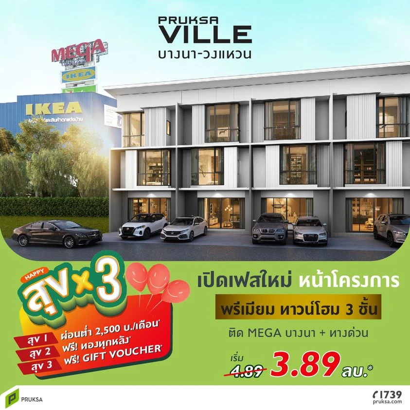PRUKSA VILLE บางนา-วงแหวน | เปิดเฟสใหม่..หน้าโครงการ!! กับพรีเมียมทาวน์โฮม 3 ชั้น ที่มาพร้อมกับการออกแบบให้ชีวิตของคุณอยู่ใจกลางความเจริญ ด้วยทำเลศักยภาพ ติด Mega บางนา และใกล้ทางด่วนกาญจนาฯ จองเลย!!
