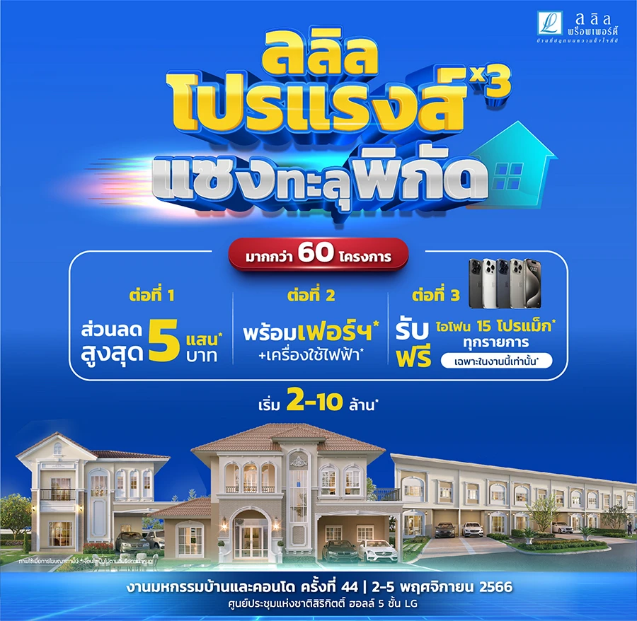 บริษัท ลลิล พร็อพเพอร์ตี้ จำกัด (มหาชน) หรือ (LALIN) ผู้พัฒนาโครงการอสังหาริมทรัพย์คุณภาพภายใต้คอนเซ็ปต์ ‘บ้านที่ปลูกบนความตั้งใจที่ดี’ อัดแคมเปญพิเศษเอาใจผู้ที่กำลังมองหาบ้านคุณภาพในช่วงโค้งสุดท้ายของปีนี้ กับโปรโมชัน “ลลิลโปรแรงส์ x3 แซงทะลุพิกัด” ในงานมหกรรมบ้านและคอนโด ครั้งที่ 44 ณ ฮอลล์ 5 ชั้น LG บูธที่ 11-15 ,46-50 ศูนย์การประชุมแห่งชาติสิริกิติ์ พร้อมมอบ 3 ความคุ้ม สู่มือผู้บริโภคเฉพาะงานนี้เท่านั้น เมื่อเลือกซื้อโครงการบ้านเดี่ยว ,ทาวน์โฮม และบ้านแนวคิดใหม่จากแบรนด์ต่างๆ ในราคาที่คุ้มค่าโดนใจ ระดับราคาตั้งแต่ 2-10 ล้านบาท* ประกอบด้วย แลนซีโอ, ไลโอ, บ้านลลิล และลลิล กรีนวิลล์ โดยพิถีพิถันด้านงานออกแบบที่เป็นเอกลักษณ์เฉพาะ ซึ่งมีความโดดเด่นทั้งภายใน และภายนอก ครบครันไปด้วยสิ่งอำนวยความสะดวกที่ทันสมัย เติมเต็มไลฟ์สไตล์ยุคปัจจุบัน พร้อมสวนส่วนกลางสีเขียวร่มรื่นสไตล์ Provence ที่จะช่วยให้วันพักผ่อนได้มีความสุขอย่างสมบูรณ์แบบ นอกจากนี้ยังมีการคัดสรรวัสดุที่ได้มาตรฐาน และเป็นมิตรต่อสิ่งแวดล้อม เพื่อยกระดับมาตรฐานการอยู่อาศัยอีกขั้นสู่สังคมคุณภาพ