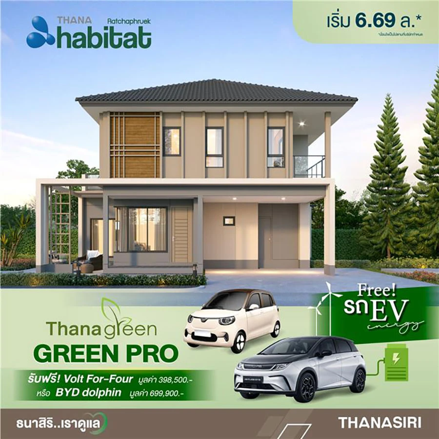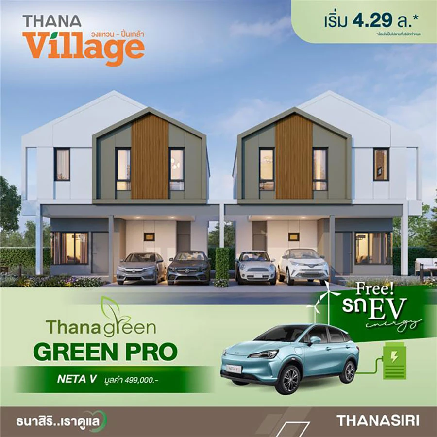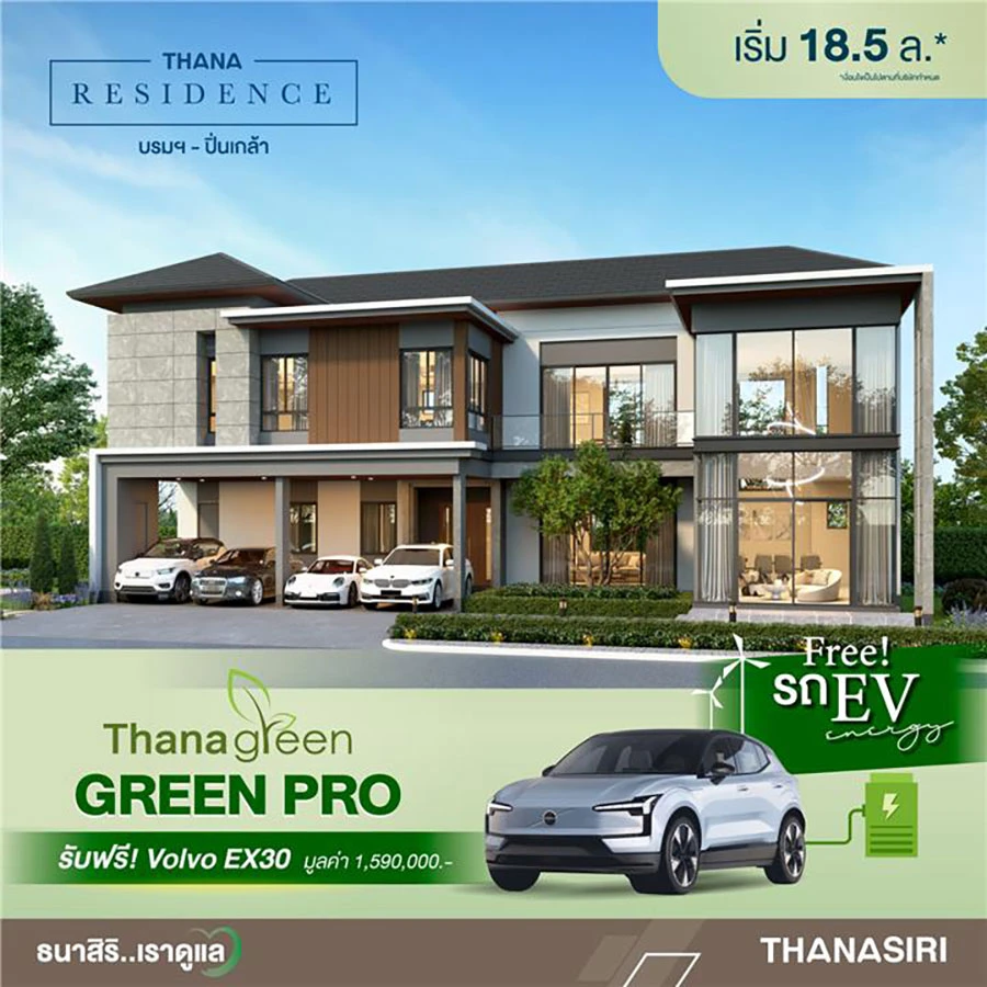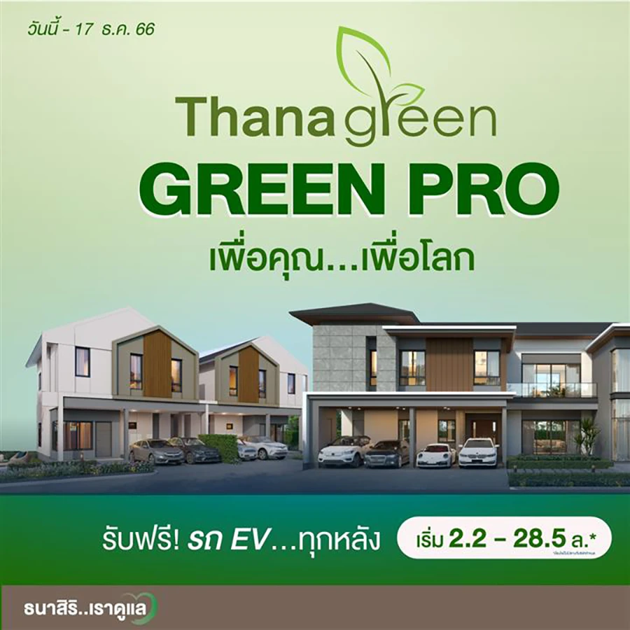 THANA จัดบิ๊กแคมเปญร่วมรักษ์โลก GREEN PRO เติมเต็มการใช้ชีวิตเพื่อหนุนคนอยากมีบ้านและรถพร้อมกัน เพียงวันนี้ถึง 17 ธ.ค. กับการซื้อบ้านใหม่ 7 โครงการคุณภาพ 70 ยูนิต ราคาเริ่ม 2.2 – 28.5 ล้านบาท* พร้อมโอนปีนี้ รับสิทธิรถไฟฟ้า (EV) ฟรี มูลค่ารวมกว่า 40 ล้านบาท เชื่อส่งผล Topline เติบโตในทิศทางบวก