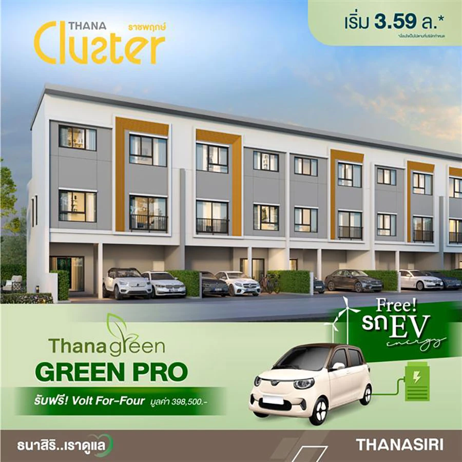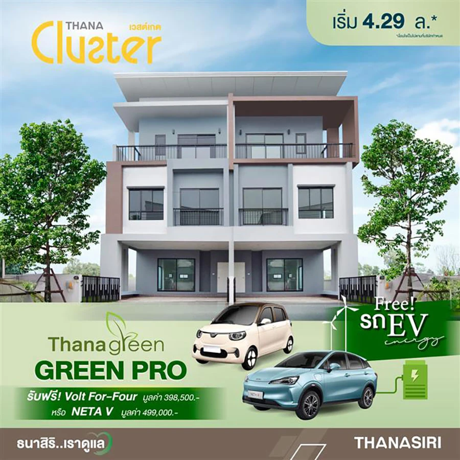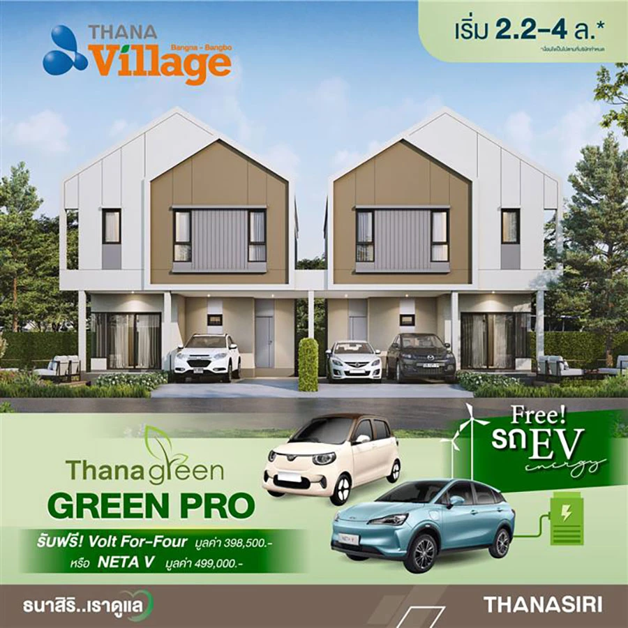 สำหรับแคมเปญ GREEN PRO เป็นกลยุทธ์ส่งเสริมการตลาดที่เริ่มตั้งแต่วันนี้ – 17 ธ.ค. 2566 เพียงซื้อบ้านที่ร่วมใน 7 โครงการ 70 ยูนิต ได้แก่ ธนาวิลเลจ บางนา - บางบ่อ, ธนาสิริวิลเลจ อุดรธานี - แอร์พอร์ต, ธนาคลัสเตอร์ ราชพฤกษ์, ธนาวิลเลจ วงแหวน - ปิ่นเกล้า, ธนาคลัสเตอร์ เวสต์เกต, อนาบูกิ ธนาฮาบิแทต ราชพฤกษ์ และ ธนาเรสซิเดนท์ บรมฯ - ปิ่นเกล้า พร้อมโอนกรรมสิทธิ์ รับสิทธิรถไฟฟ้า (EV) ฟรี มูลค่า 398,500 – 1,590,000 บาท* ประกอบด้วย รถ EV แบรนด์ VOLT For-Four, NETA V, BYD Dolphin, VOLVO Ex30 (ตามโปรโมชั่นรายโครงการ)