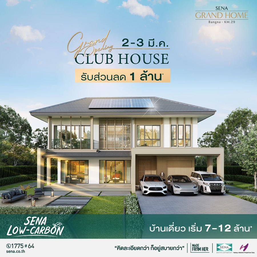 1. เสนา แกรนด์ โฮม บางนา-กม.29 บ้านเดี่ยว 2 ชั้น ที่มีกลิ่นอายของความเป็นญี่ปุ่นในการออกแบบแนวคิดญี่ปุ่น และยังออกแบบเพื่อการลดใช้พลังงาน ตามแนวคิด "บ้านพลังงานเป็นศูนย์" ที่ช่วยลดการใช้พลังงานสูงสุดกว่า 38% การันตีด้วยรางวัลผู้พัฒนาที่พักอาศัยประหยัดไฟ เบอร์ 5 จากการออกแบบโดยการคำนึงถึงการลดใช้พลังงานทั้งพื้นที่ส่วนกลางและตัวบ้าน พร้อม Solar Cell และ EV Ready ในบ้านทุกหลัง พร้อมสิ่งอำนวยความสะดวก รองรับกิจกรรมทุกช่วงวัย ทั้งคลับเฮาส์, สระว่ายน้ำ, ฟิตเนส, Co-Working Space, สวนพักผ่อน สนามเด็กเล่น และ pet park บนทำเลติดถนนบางนา-ตราด ใกล้แหล่งงาน 3 นิคม นิคมเวลโกรว์ นิคมเอเชีย และนิคมบางพลี เป็นส่วนตัวเพียง 97 ยูนิต ราคาเริ่มต้น 7 – 12 ล้านบาท เปิด Grand Opening คลับเฮ้าส์ ในวันที่ 2-3 มีนาคม พร้อมมอบสิทธิพิเศษรับส่วนลด 1 ล้านบาท เมื่อจองภายในงาน