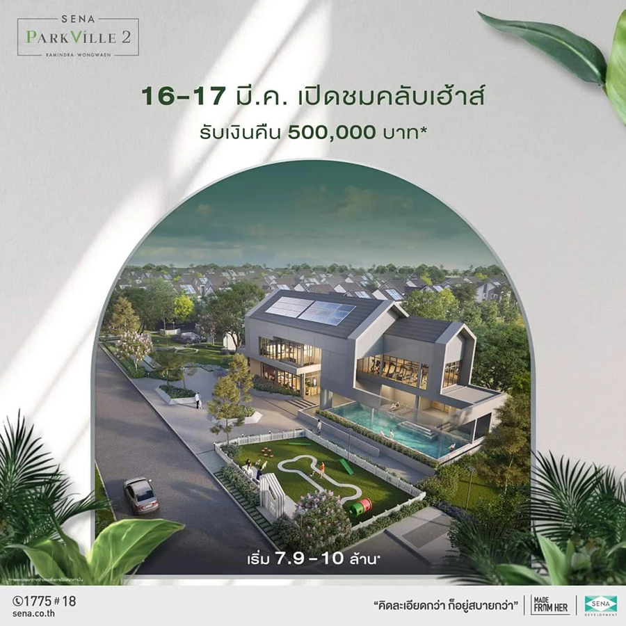 2. เสนา พาร์ควิลล์ 2 รามอินทรา โครงการบ้านแฝดและบ้านเดี่ยว 2 ชั้น เหมาะสำหรับครอบครัวคนรุ่นใหม่ที่ต้องการที่พักอาศัยบนทำเลศักยภาพย่านรามอินทรา-วงแหวน ที่ห้อมล้อมไปด้วยสิ่งอำนวยความสะดวกในชีวิตประจำวันที่ครบครันเป็นอีกโครงการของเสนาฯ ที่พัฒนาขึ้นบนทำเลศักยภาพย่านรามอินทรา-วงแหวนโดยตัวโครงการตั้งอยู่บนถนนเลียบวงแหวนกาญจนาภิเษก เชื่อมตรงจากถนนรามอินทรา กม.9 ใกล้ศูนย์การค้าแฟชั่นไอส์แลนด์เพียง 5 นาที และสามารถเลือกเดินทางได้หลายเส้นทาง ทั้งจากทางถนนแจ้งวัฒนะ, ถนนนวมินทร์, ถนนเกษตรนวมินทร์ ใกล้ทางด่วนรามอินทรา-อาจณรงค์ และใกล้รถไฟฟ้าสายสีชมพู สถานีรามอินทรา ก.ม.9 พร้อมมี Shuttle car รับส่ง นอกจากนี้ยังมีพื้นที่ส่วนกลางขนาดใหญ่ พร้อมสิ่งอำนวยความสะดวกภายในโครงการที่ครบครันและตอบโจทย์การอยู่อาศัยของคนทุกวัย ราคาเริ่มต้น 7.9 – 10 ล้าน* เปิดชมคลับเฮ้าส์และพรีเซลล์ในวันที่ 16-17 มีนาคม พร้อมมอบสิทธิพิเศษ รับเงินคืน 500,000 บาท เมื่อจองภายในงาน รับเพิ่ม ไอโฟน 15