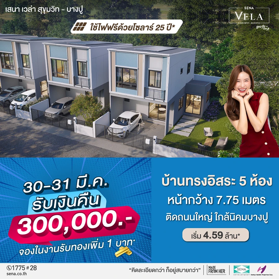 1. เสนา เวล่า สุขุมวิท-บางปู โครงการบ้านแนวคิดใหม่ ฟังก์ชันบ้านเดี่ยว พร้อมนวัตกรรม Solar Roof ช่วยประหยัดพลังงานภายในบ้านและส่วนกลาง ตั้งอยู่บน ถ.สุขุมวิท ต.บางปูใหม่ อ.เมืองสมุทรปราการ จ.สมุทรปราการ เดินทางสะดวก ติดถนนสุขุมวิท-บางปู ติดโลตัส บางปู มีรถสาธารณะผ่านอยู่ใกล้ชุมชน โรงเรียน โรงพยาบาลเพื่อความสะดวกสบายและความปลอดภัยให้กับคุณและครอบครัว ออกแบบภายใต้แนวคิด "Geo fit+ (จีโอฟิต พลัส)" จากประเทศญี่ปุ่น เป็นการรวบรวมความคิดเห็นของผู้อยู่อาศัย นำมาปรับปรุง ออกแบบพัฒนาในทุกมิติ และผสานกับแนวคิด "Made From Her และ Sena Green Power" เทคโนโลยีที่ช่วยในเรื่องพลังงานสะอาด ราคาเริ่มต้น 4.59 ล้านบาท ในวันที่ 30-31 มีนาคม จองในงานรับเพิ่มทองคำ 1 บาท พร้อมมอบสิทธิพิเศษรับเงินคืน 300,000 บาท