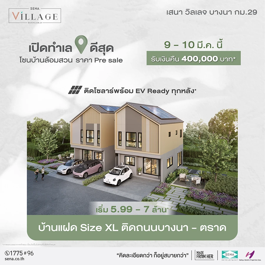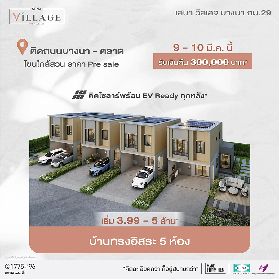2. เสนา วิลเลจ บางนา กม.29 เป็นโครงการบ้านทรงอิสระ แนวใหม่ ผนังบ้านไม่ติดใคร ภายใต้แนวคิด "บ้านพลังงานเป็น 0" ช่วยประหยัดไฟได้สูงสุด 38%* บนทำเลที่ดีที่สุดติดถนนบางนา-ตราด ใกล้แหล่งงาน 3 นิคม นิคมเวลโกรว์ นิคมเอเชีย และนิคมบางพลี ใช้ไฟฟรีจากโซลาร์ประหยัดค่าไฟสูงสุด 14,700 บาท/ปี* และคลับเฮ้าส์ขนาดใหญ่ ฟังก์ชันครบ สระว่ายน้ำ, ฟิตเนส Co-Working Space, สวนพักผ่อน และสนามเด็กเล่น ในราคาเริ่มต้น 3.99 ล้าน สำหรับบ้านทรงอิสระ และ เริ่ม 5.99 ล้าน สำหรับบ้านรุ่นใหม่ ไซส์ XL พร้อมมอบสิทธิเศษ รับเงินคืน สูงสุด 400,000 บาท เมื่อจองภายในงาน "เปิดทำเลดีสุด ราคา Pre Sale" ในวันที่ 9-10 มีนาคม
