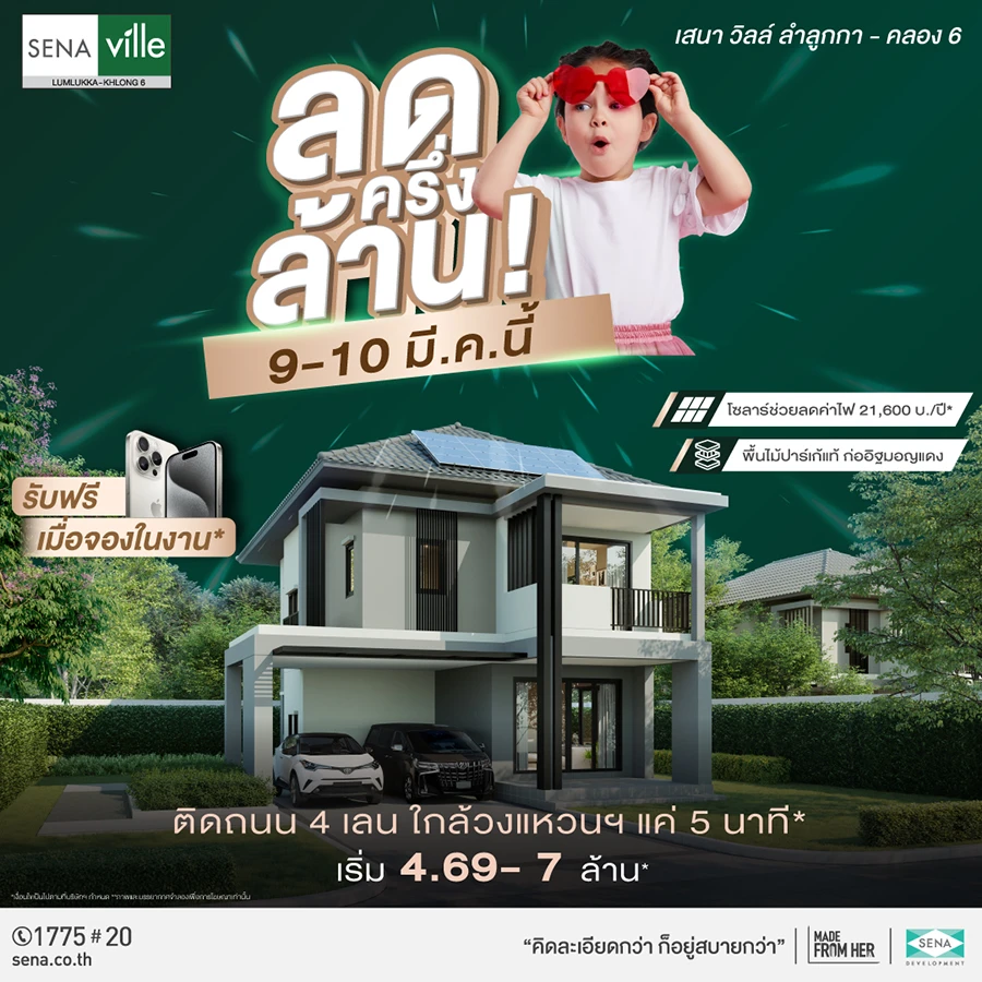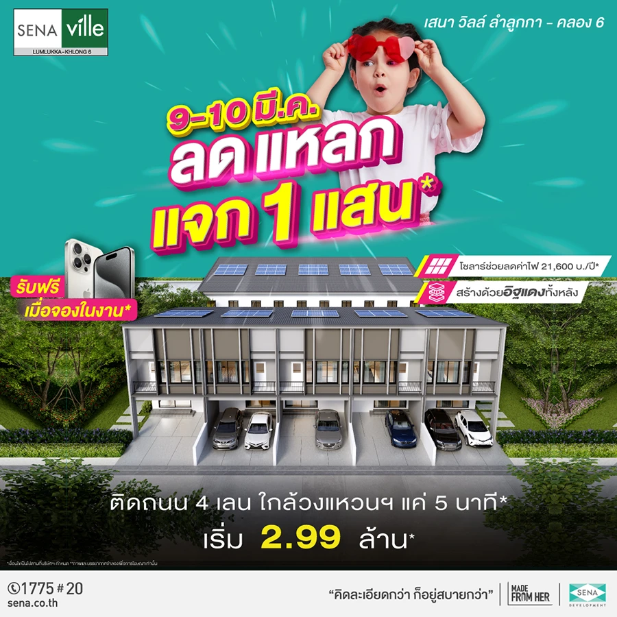1. เสนาวิลล์ ลำลูกกา-คลอง 6 ติดถนน 4 เลน ใกล้วงแหวนฯ เป็นโครงการบ้านเดี่ยว บ้านแฝด และทาวน์โฮม 2 ชั้น จำนวน 202 ยูนิต บนแนวคิด "Sena Solar House" ที่นำพลังงานจากแสงอาทิตย์มาใช้ภายในโครงการ ทั้งบ้านพักอาศัยและพื้นที่ส่วนกลาง ช่วยประหยัดไฟอย่างยั่งยืน และยังรักษ์โลกไปพร้อมกัน บ้านทุกหลังติดตั้ง Solar Roof และสามารถเพิ่มแผง Solar Cell ได้ตามการใช้งานสูงสุด 5 kw ช่วยประหยัดค่าไฟได้สูงสุด 14,700 บาทต่อปี* ในราคาเริ่มต้น 2.99 ล้าน และ เริ่มต้น 4.69 ล้าน สำหรับบ้านเดี่ยว เตรียมเปิดพรีเซลล์ในวันที่ 9-10 มีนาคม พร้อมมอบสิทธิพิเศษ แจกโปรฉ่ำ 100,000 บาท