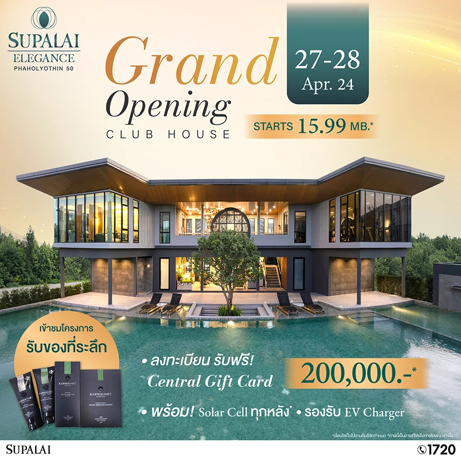 Grand Opening ศุภาลัย เอเลแกนซ์ พหลโยธิน 50 พร้อมเปิด Club House อย่างเป็นทางการ วันที่ 27-28 เมษายนนี้ เชิญทุกท่านร่วมชมสวนส่วนกลางสีเขียวขนาดใหญ่กว่า 1 ไร่ และคลับเฮ้าส์สุดหรูขนาดใหญ่ พร้อมห้องอเนกประสงค์ สระว่ายน้ำ ฟิตเนส รองรับทุกกิจกรรมของทุกคนในครอบครัว เป็นเจ้าของบ้านเดี่ยวหรู 3 ชั้น ราคาเริ่มต้นที่ 15.9 ล้านบาท