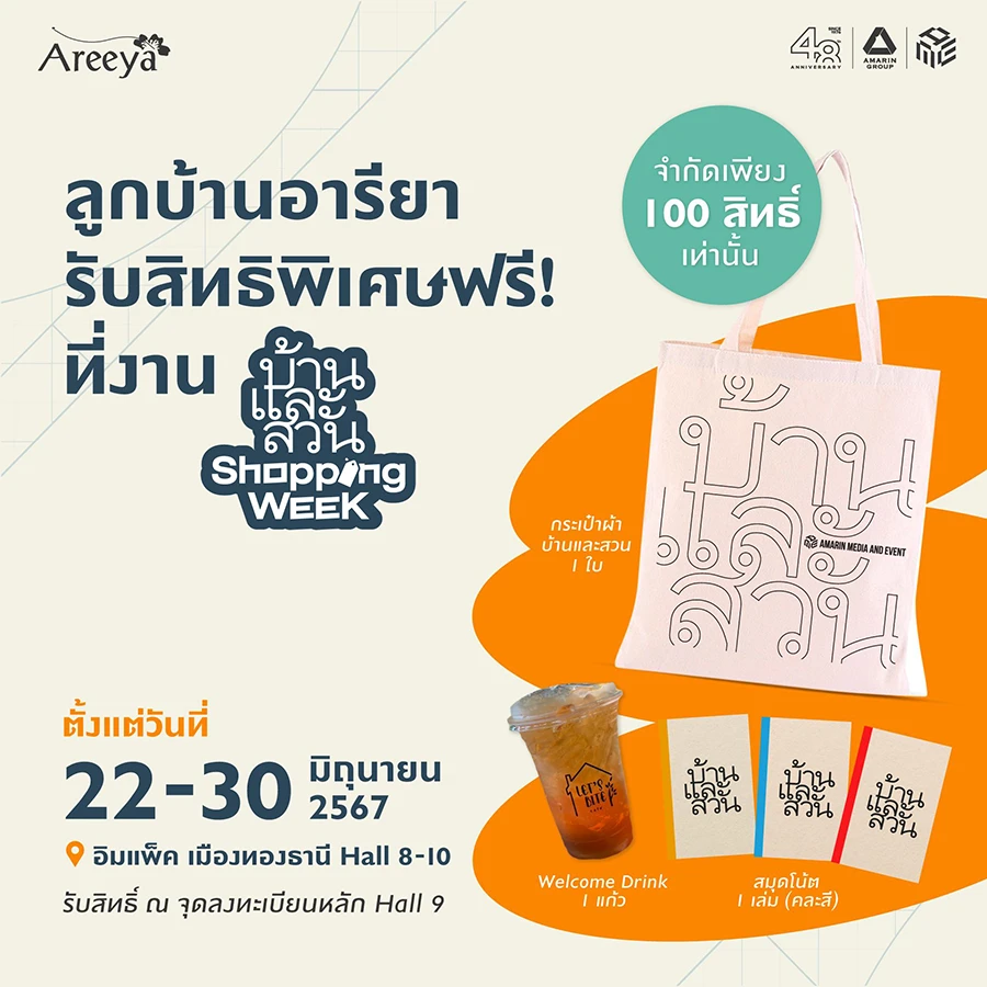 *สงวนสิทธิ์สําหรับลูกบ้าน Areeya Family ที่ลงทะเบียนงานบ้านและสวน Shopping Week ตั้งแต่วันนี้-30 มิ.ย. 67 เท่านั้น