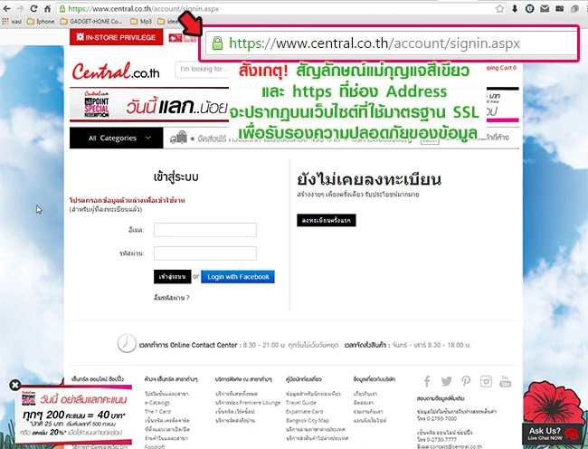 ตัวอย่างหน้าเว็บไซต์ที่ได้รับรองมาตรฐานความปลอดภัย SSL (Secure Socket Layer) ยืนยันว่าการรับส่งข้อมูล