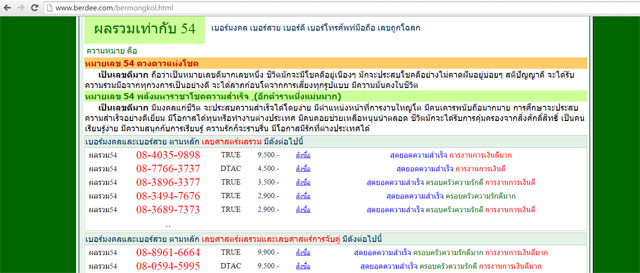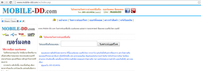 2. ตรวจสอบจากเว็บไซด์ที่ให้บริการ เช่น www.mobile-dd.com ซึ่งนับเป็นวิธีที่ง่าย เพียงคุณนำเบอร์โทรศัพท์ไปกรอกตามระบบที่เว็บนั้นจัดไว้ให้ เพียงเท่านี้ก็ได้เลขผลลัพธ์ พร้อมกับบทวิเคราะห์ว่าเบอร์ของคุณดีหรือไม่อย่างไร?