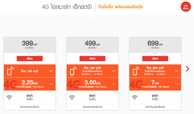 2. 4G ไอสมาร์ท เอ้กซ์ตร้า โปรนี้จะเน้น โทรไม่อั้น พร้อมเล่นเน็ตจุใจ โดยมีค่าบริการให้เลือกตั้งแต่ 399 บาท จนถึง 1,299 บาท ใช้เน็ตได้สูงสุด 22GB