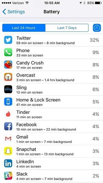 คนเราส่วนใหญ่นั้นมักจะใช้เวลาหมดไปกับการเล่นมือถือ แต่เอ๊ะ! เคยสำรวจตัวเองไหมคะว่า ในแต่วันเราหมดเวลาไปกับแอปฯ ไหนมากที่สุด เรามีวิธีเช็คดูได้ค่ะว่าในแต่ละวันแอปพลิเคชั่นไหนเราใช้งานบ่อย และแต่ละแอปฯ เราใช้เวลานานมากน้อยแค่ไหน เพียงแค่เข้าไปที่ Settings > Battery แล้วเลือกไปที่รูปนาฬิกา จะปรากฏระยะเวลารวมที่เราใช้ไปกับแต่ละแอปฯใน 24 ชั่วโมงล่าสุด และยังสามารถดูย้อนหลังได้ 7 วันเลยทีเดียว