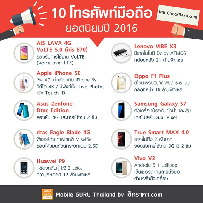 10 โทรศัพท์มือถือยอดนิยมปี 2016 โดย Checkraka.com